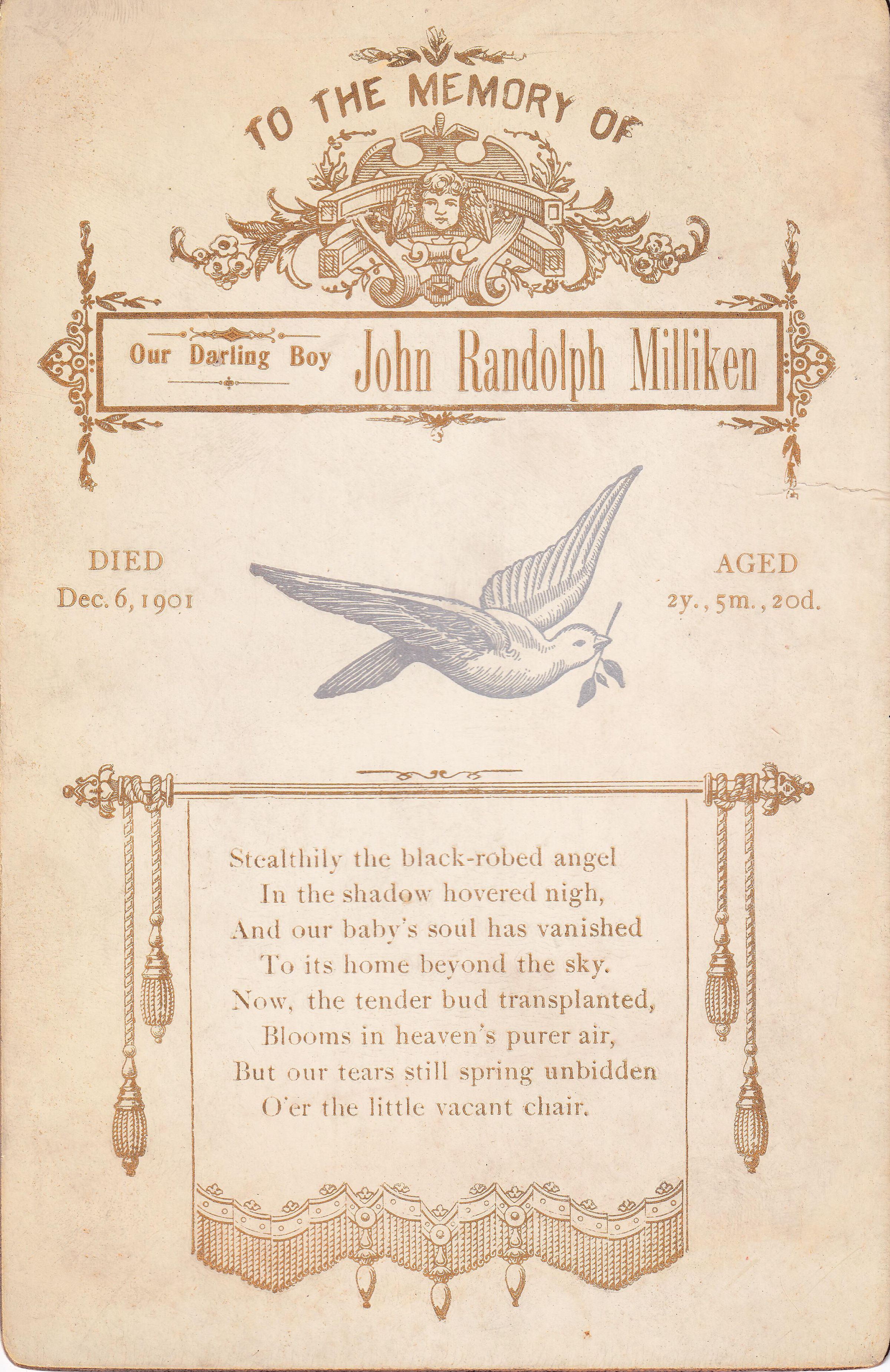 Source Citation: Funeral card of John Randolph Milliken [1899-1901]; item no. TOOG-AN001-0002-0020, Throckmorton Series, Glenn Jacob Roy Thornton Toothman III Collection, Greene Connections Archives Project (www.GreeneConnections.com).