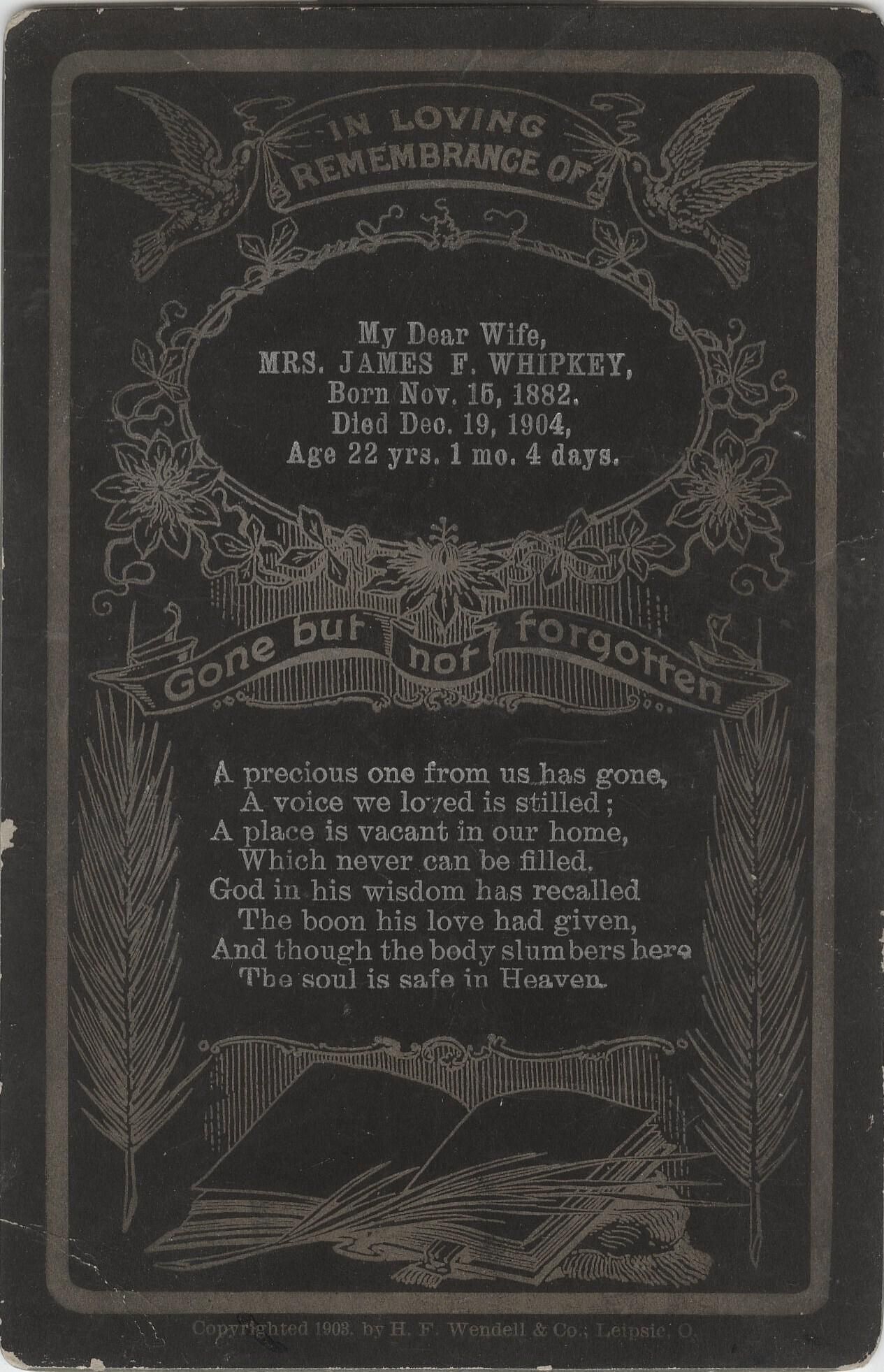 Funeral card of Louie (Rinehart) Whipkey [1882-1904] - wife of James Freeman Whipkey, daughter of George N. Rinehart & Hester Moore.