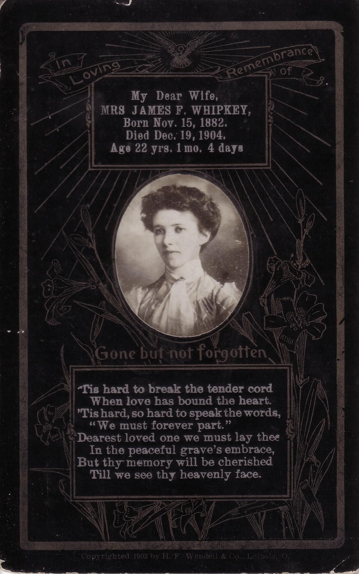 Funeral card of Louie (Rinehart) Whipkey [1882-1904] - wife of James Freeman Whipkey, daughter of George N. Rinehart & Hester Moore.