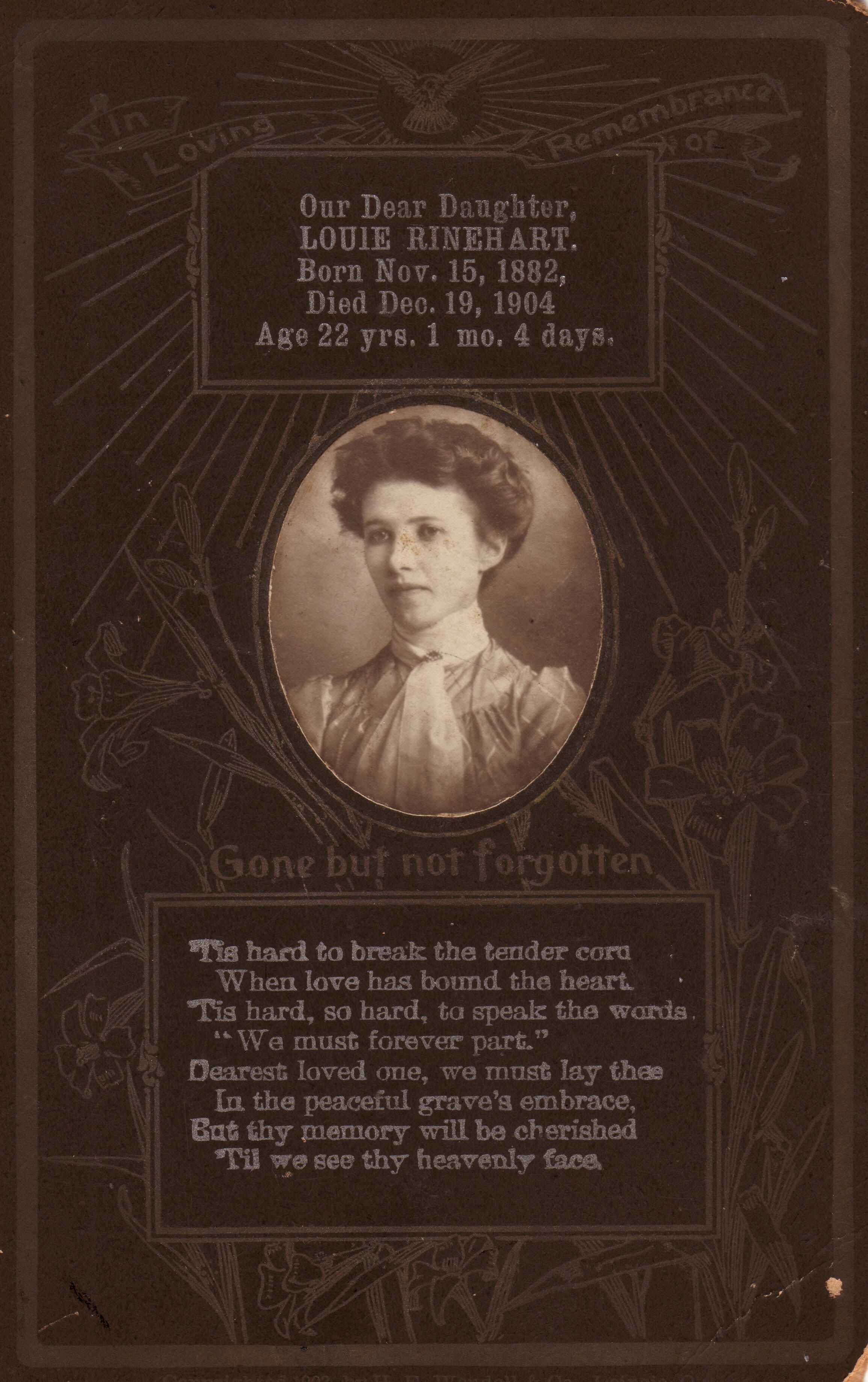 The funeral card reads, "Our Dear Daughter, / Louie Rinehart. / Born Nov. 15, 1882, / Died Dec. 19, 1904 / Age 22 yrs. 1 mo. 4 days."