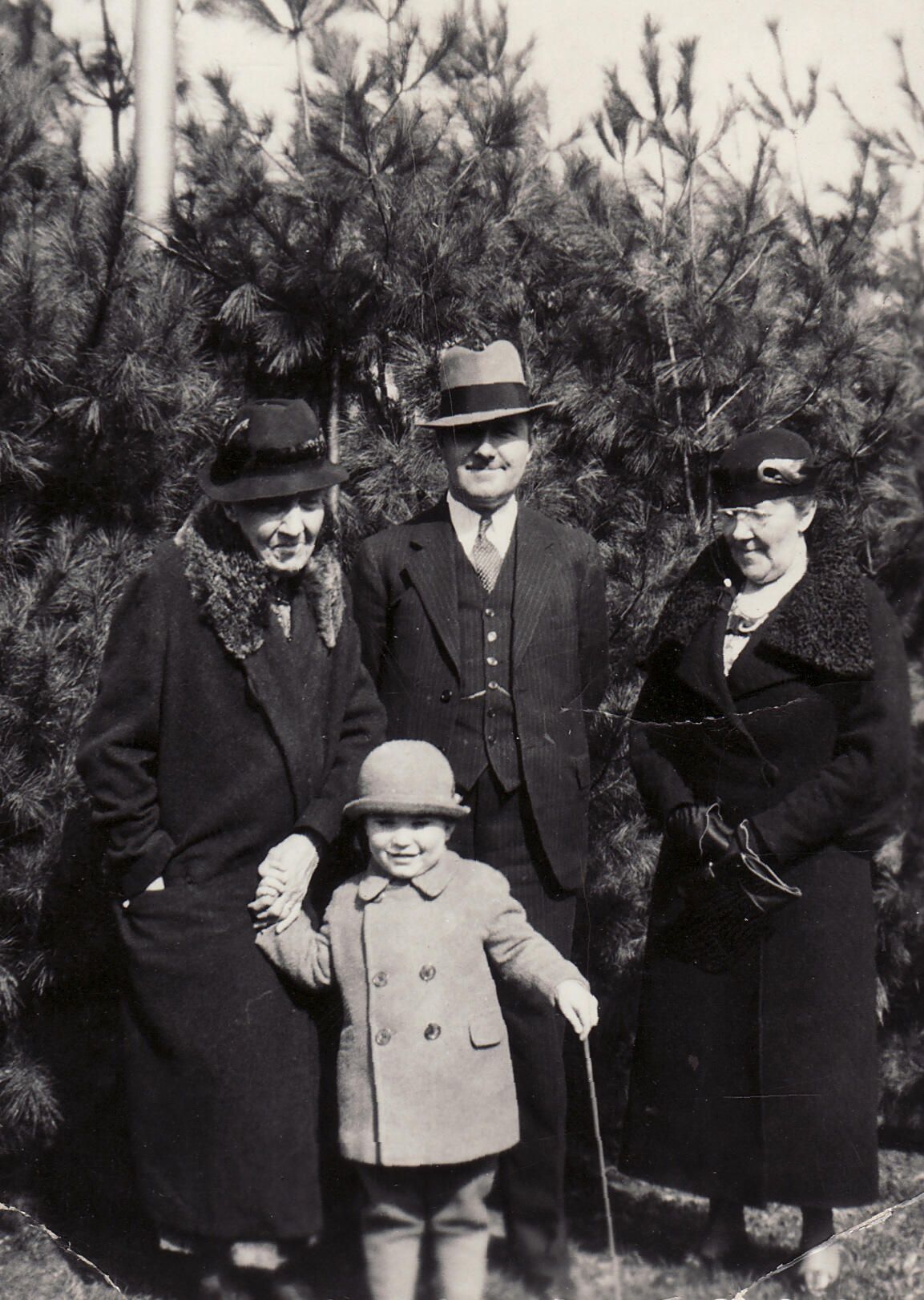 SOURCE CITATION: Four generations, pictured [Left-Right]: Sarah Jane (Orndoff) Wood [1857-1941] holding the hand of her great-grandson Charles Hiram Ganiear [1932-2020], John Wood Ganiear [1901-1963], Nora (Wood) Ganiear [1878-1974]; circa 1932-1935; item no. GANI-AN001-0015; Ganiear Series, Charles Wood Ganiear and Lori Melanie (Campo) Ganiear Collection, Greene Connections: Greene County, Pennsylvania Archives Project (www.GreeneConnections.com).