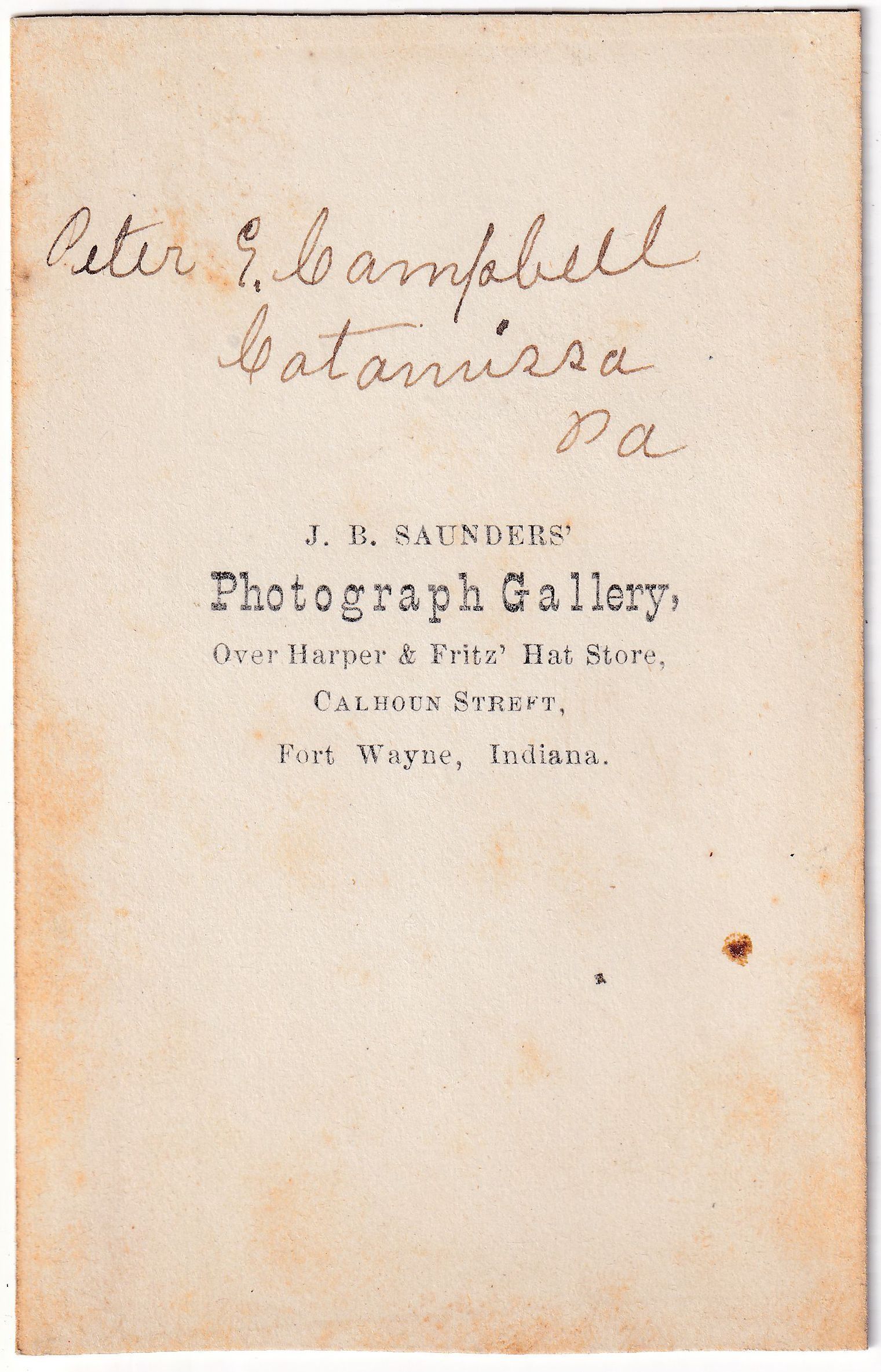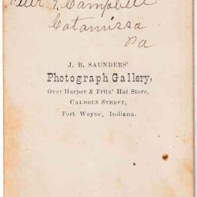 SOURCE CITATION: Geho Album 01, Photo 14 - Peter G. Campbell [1825-]; circa 1865-1875, image by J. B. Saunders' Photograph Gallery, Over Harper & Fritz' Hat Store, Calhoun Street, Fort Wayne, Indiana; item no. CMBL-AN004-0001-0014, George Lindsey Cole Series, Matt W. Cumberledge Collection; Greene Connections Archives Project (GreeneConnections.com).