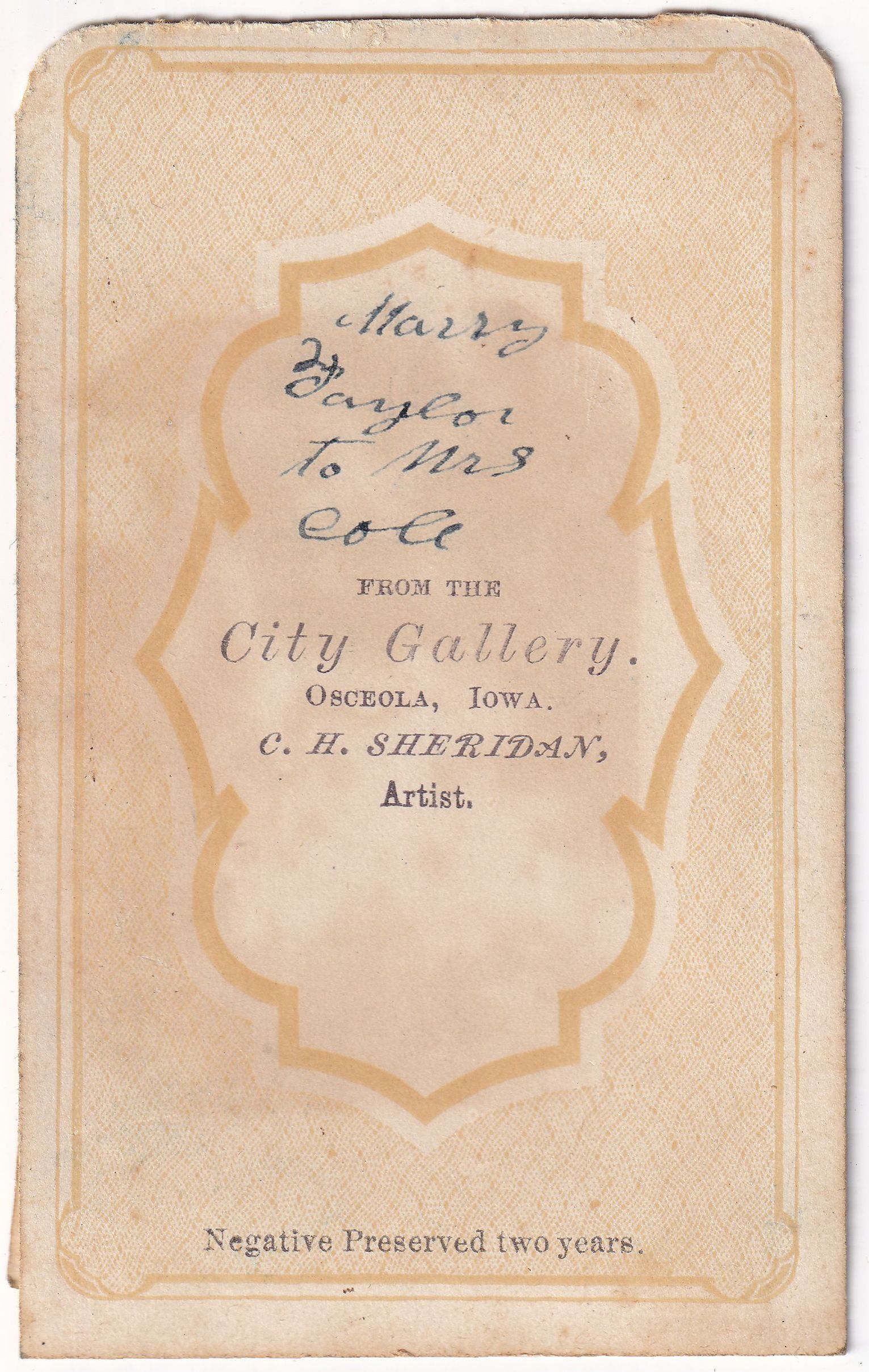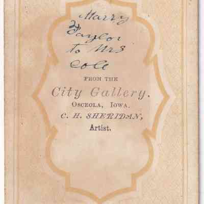 SOURCE CITATION: Geho Album 01, Photo 23 - Handwritten inscription on reverse of image reads, "Marry / Taylor / to Mrs. / Cole"; circa 1865-1875, image by City Gallery, Osceola, Iowa, C. H. Sheridan, Artist; item no. CMBL-AN004-0001-0023, George Lindsey Cole Series, Matt W. Cumberledge Collection; Greene Connections Archives Project (GreeneConnections.com).