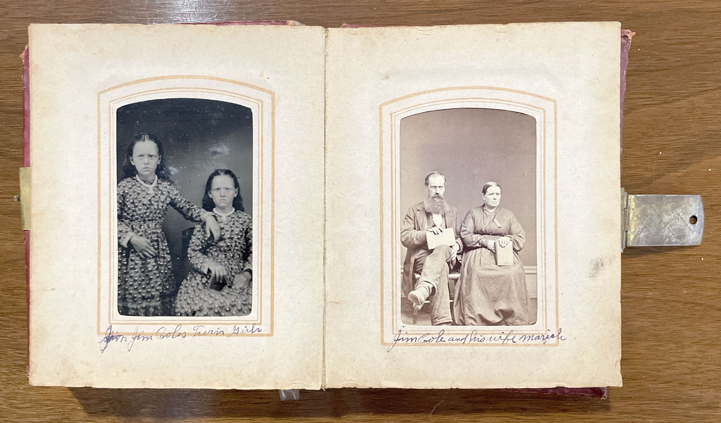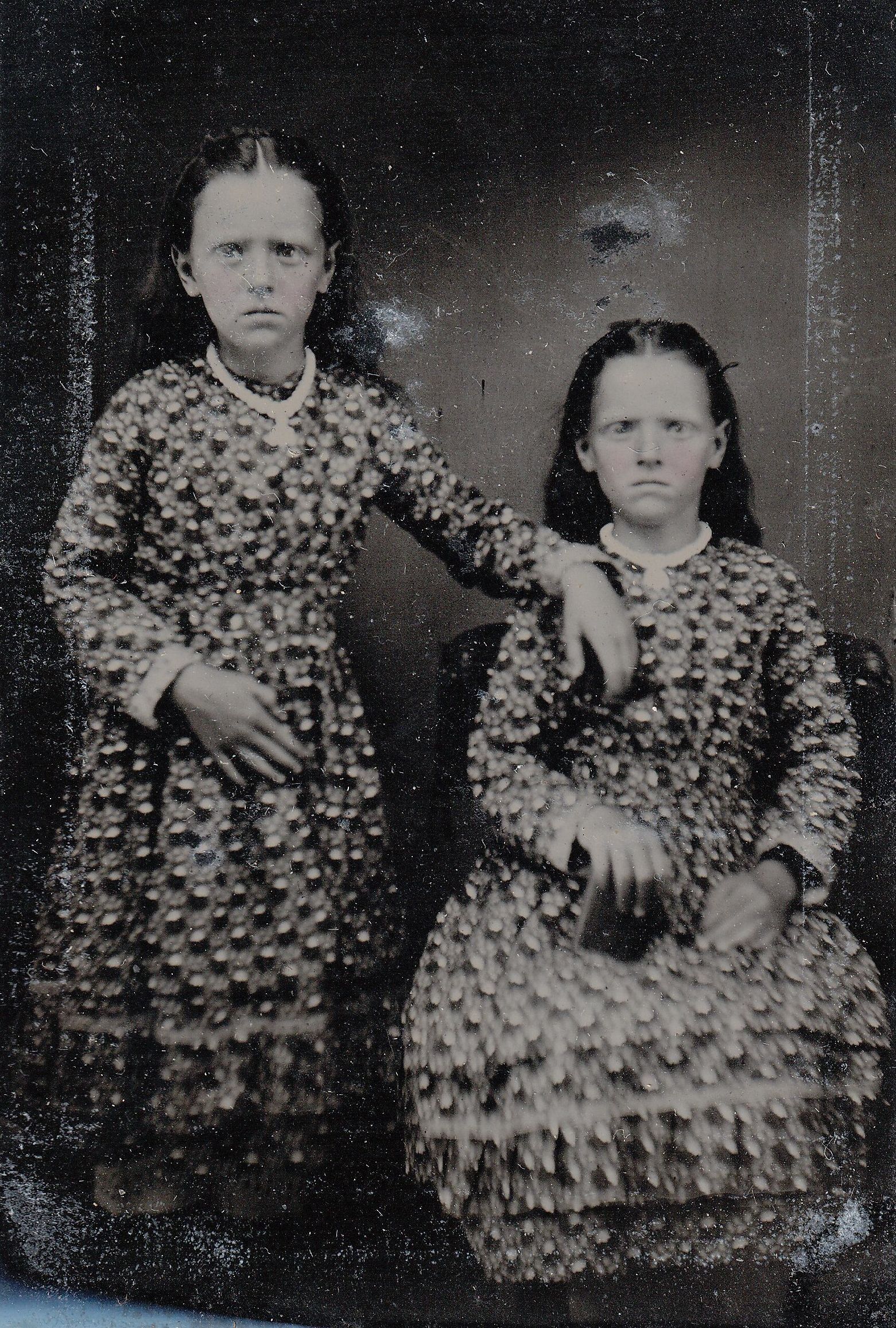 SOURCE CITATION: Geho Album 01, Photo 28 - [Order Unknown] Elizabeth Jane (Cole) Kuhn [1867-1936] and Sarah Catherine (Cole) Gallentine [1867-1940] - twin daughters of James L. Cole and Mariah Abigail Geho; circa 1875-1880; item no. CMBL-AN004-0001-0028, George Lindsey Cole Series, Matt W. Cumberledge Collection; Greene Connections Archives Project (GreeneConnections.com).