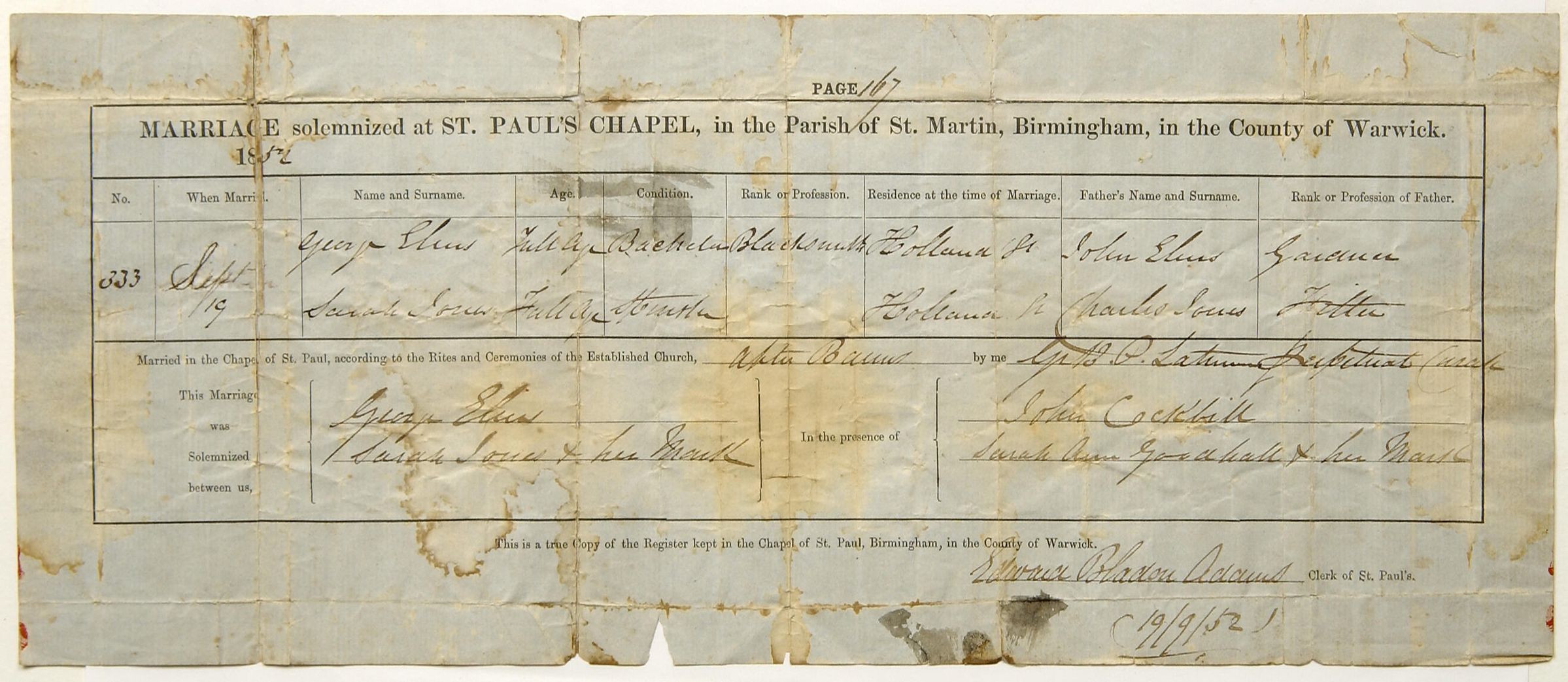 Elms-Jones marriage certificate, no. 333, 19 September 1852, St. Paul's Chapel, Birmingham (St. Martin Parish), Warwickshire County, England; held by Greene County Historical Society (918 Rolling Meadows Road, P.O. Box 127; Waynesburg, Pennsylvania 15370). Researched and digitized for the Greene Connections: Greene County, Pennsylvania Archives Project between 2005-2014.Collection