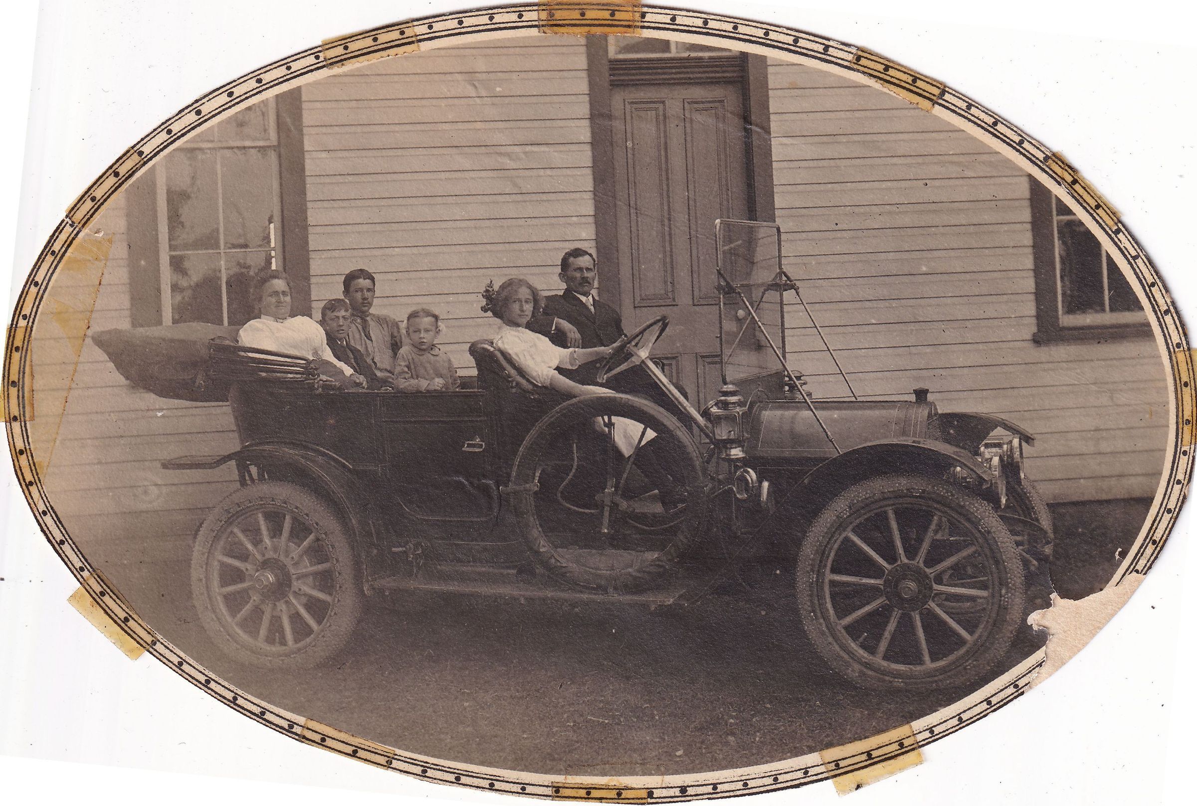 SOURCE CITATION: [Left-Right]: BACK SEAT - Jessie Dell (McFarland) Vance [1868-1935] and unidentified children, FRONT SEAT - Mary (Vance) McCann [1898-1987] and George Birch Vance [1870-1928]; circa 1910-1915; item no. MILB-AN001-0006-0020, Vance Series, Mary (Vance) McCann Collection, shared by her grandson, William Marshall Miller; Greene Connections Archives Project (www.GreeneConnections.com).