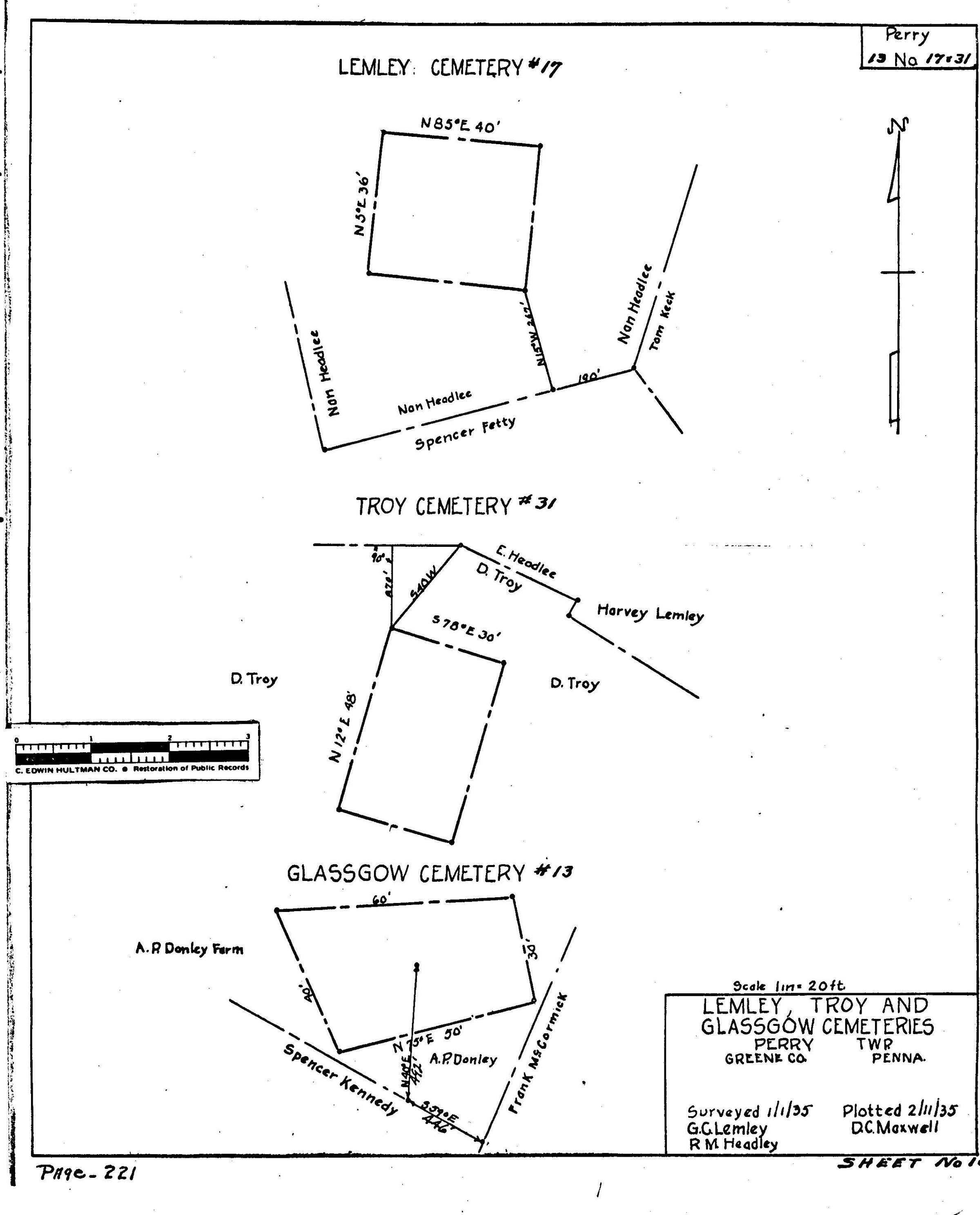 SOURCE CITATION: WPA Cemetery Plat - Pennsylvania - Greene County - Perry Township - Glassgow Cemetery (1935), item no. 2016.3.85, Cemetery Plat (WPA) Collection, surveyed by Works Projects Administration, copy on file at the Clerk of Courts Office, Greene County Courthouse, Greene Connections Archives Project (www.GreeneConnections.com).