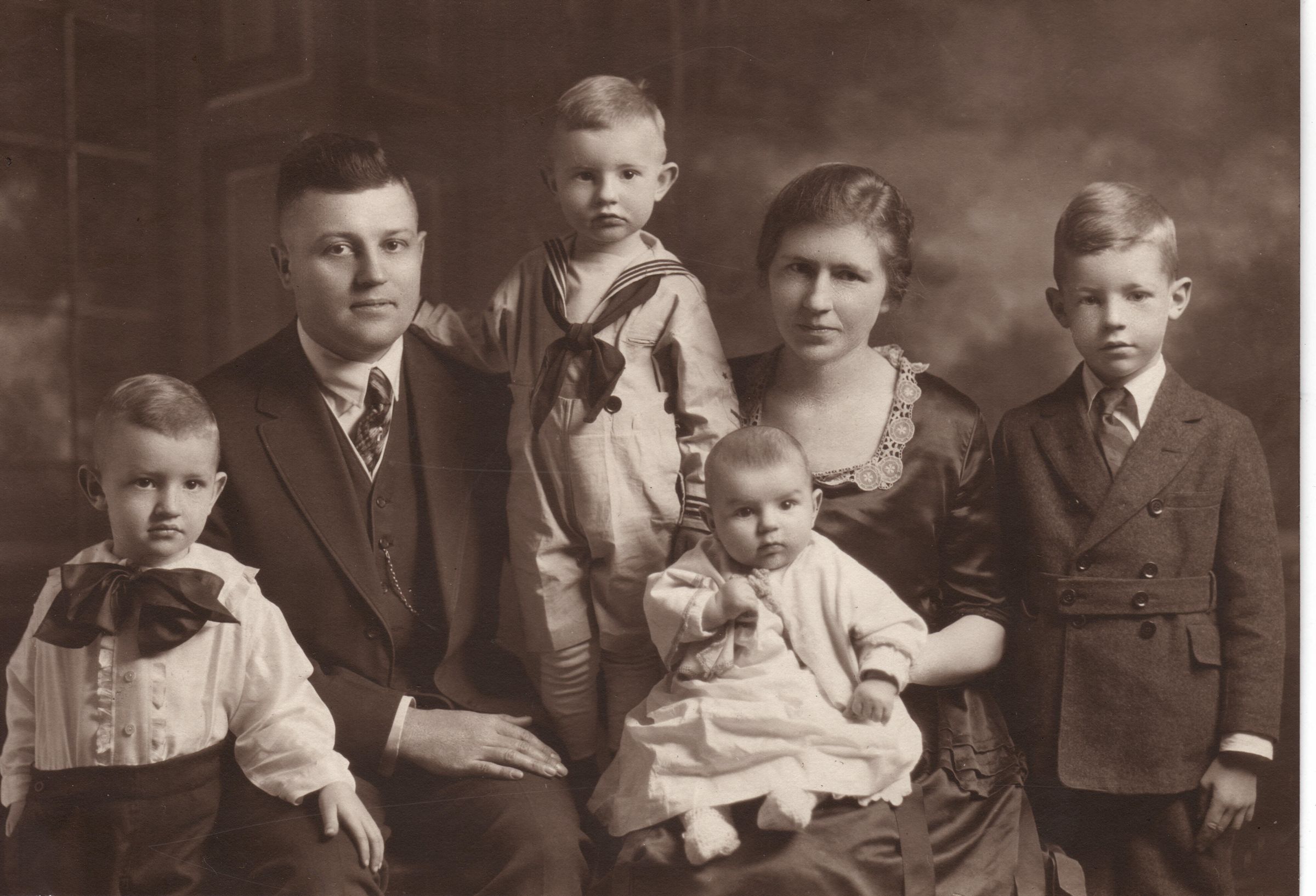 SOURCE CITATION: [Left-Right]: Frederick Rees Toothman, Glenn Jacob Roy Thornton Toothman Sr., Glenn Jacob Roy Thornton Toothman Jr., Elsie Huffman (Rees) Toothman holding Melvin Lee Toothman, James Sterling Toothman; circa 1922; item no. TOOL_AN001_0006, Toothman Series, Melvin Lee Toothman Collection, Greene Connections Archives Project (www.GreeneConnections.com).