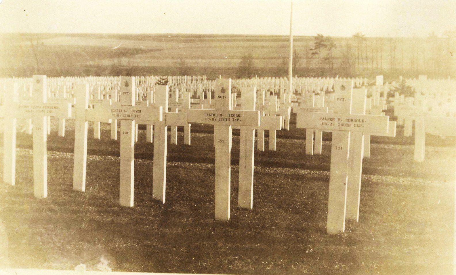 Source Citation: Temporary grave of Walter Bertram Riggle, Lieutenant, Company K, 110th Infantry, 28th Division, killed in action 29 July 1918, Cierges, France; item no. RIGL-AN001-0031, Lewis Perry and Nora Etta (Kuhn) Riggle Collection, shared by Paula (Riggle) Whitfill and her aunt Joyce (Riggle) Hoover, Greene Connections Archives Project (www.GreeneConnections.com).
