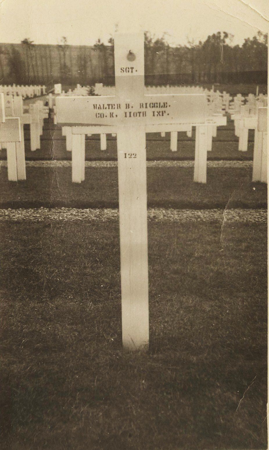 Source Citation: Temporary grave of Walter Bertram Riggle, Lieutenant, Company K, 110th Infantry, 28th Division, killed in action 29 July 1918, Cierges, France; item no. RIGL-AN001-0030, Lewis Perry and Nora Etta (Kuhn) Riggle Collection, shared by Paula (Riggle) Whitfill and her aunt Joyce (Riggle) Hoover, Greene Connections Archives Project (www.GreeneConnections.com).