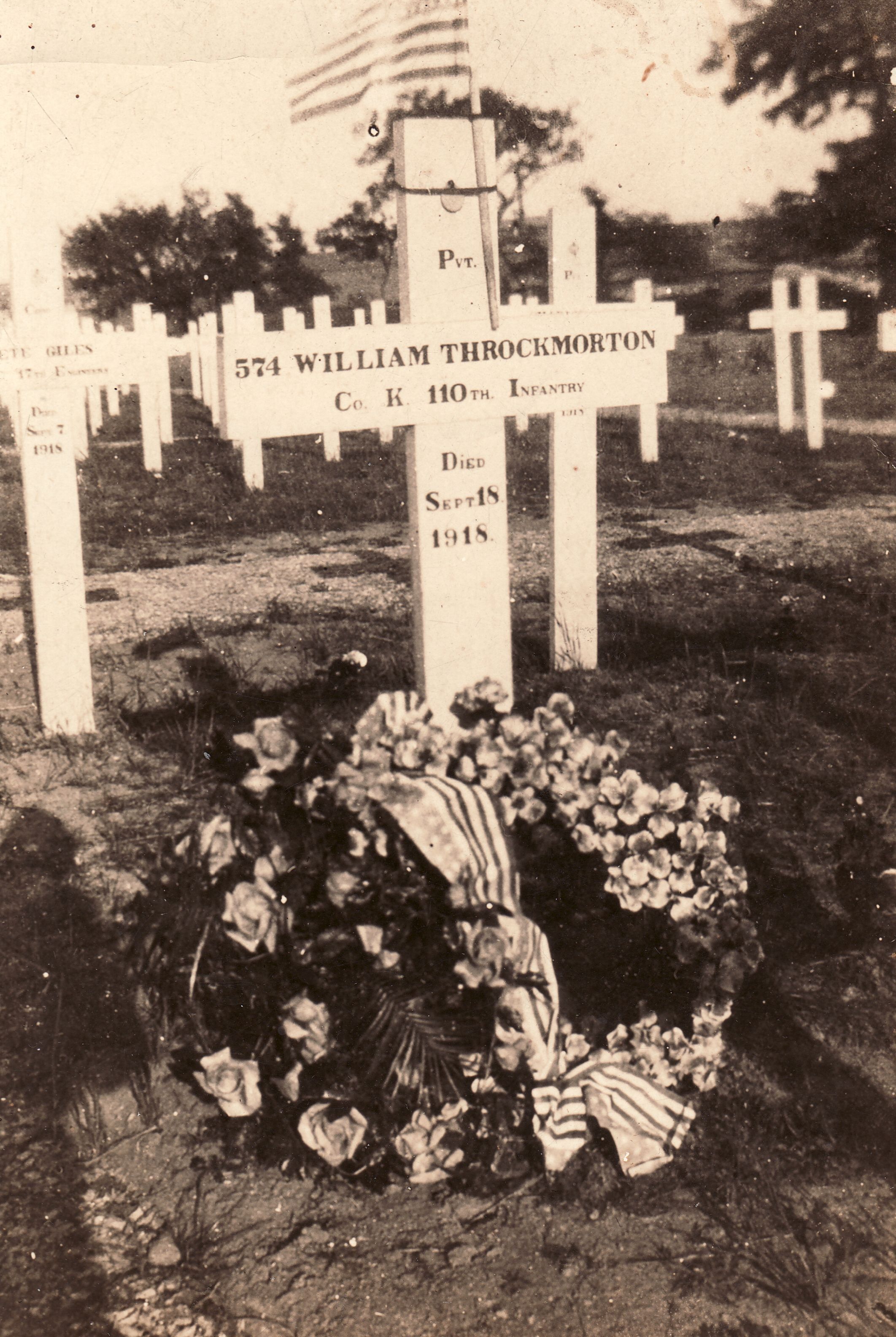 Grave of William Webster Throckmorton in France. William was wounded in battle on 29 July 1918 during World War I. While hospitalized to recover he became a victim of the flu epidemic, leading to pneumonia. He died 18 September 1918 just before being sent home. Following the end of the war, William's temporary grave in Europe was vacated and he was returned to Waynesburg, Pennsylvania, for interment in the family mausoleum at Oakmont Cemetery on 8 October 1920.