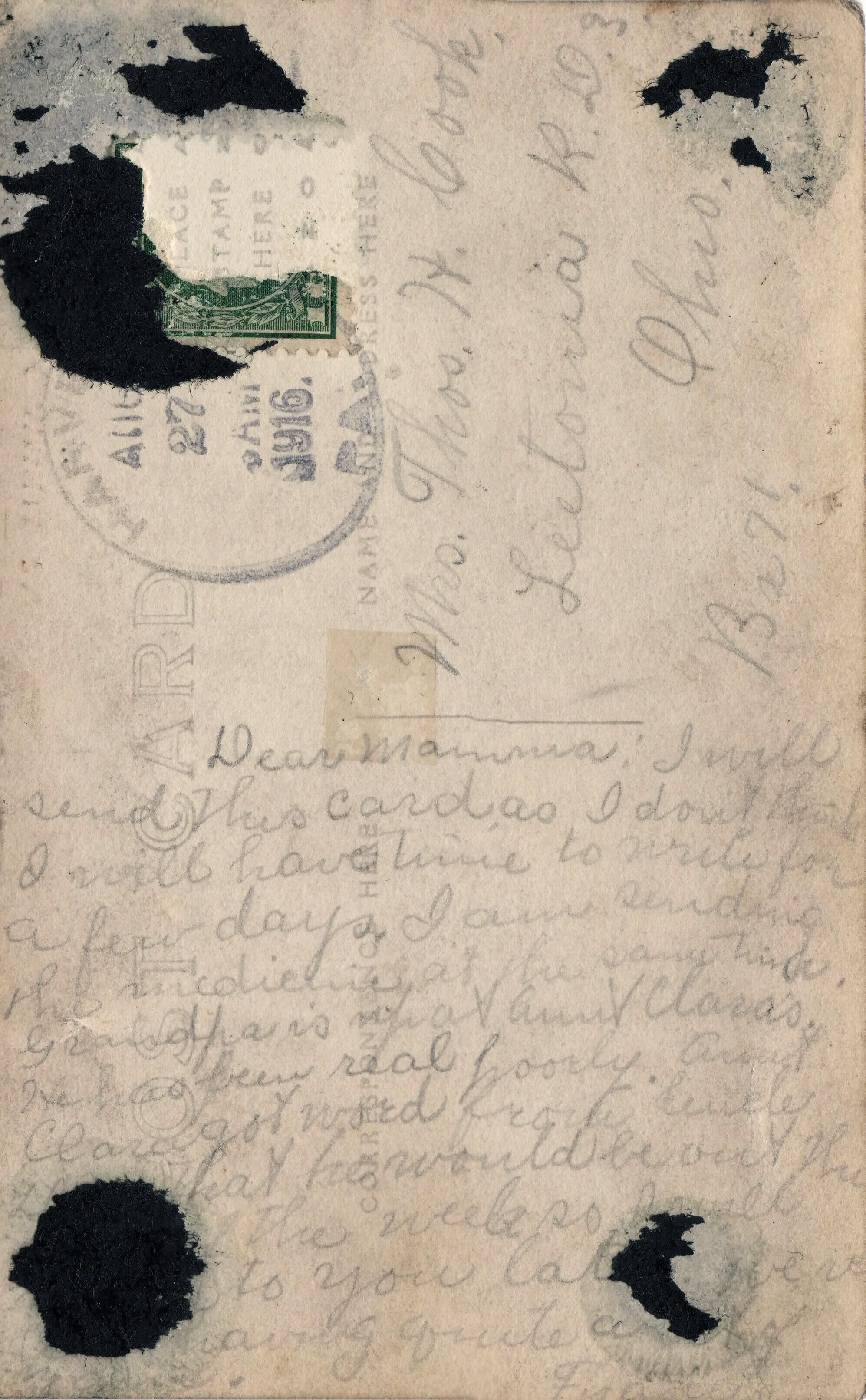 "Dear Mamma, I will send this card as I don't think I will have time to write for a few days. I am sending the medicine at the same time. Grandpa is up at at Aunt Clara's. He has been real poorly. Aunt Clara got word from Uncle [David ?] that he would be out the [writing obscured] the week so I will [writing obscured] to you [writing obscured]. We are having quite a [writing obscured]. Frances."Photograph Details
