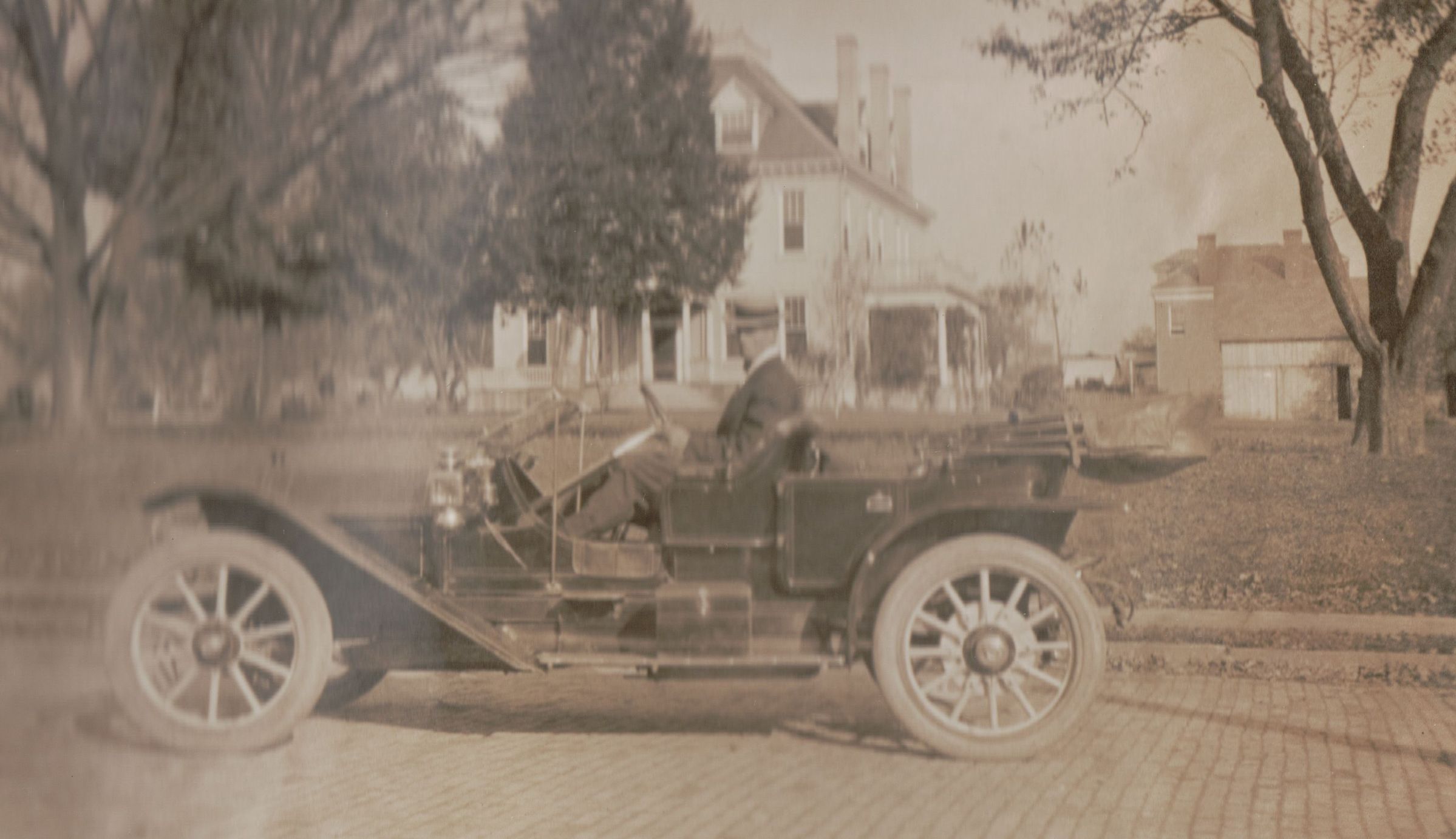 SOURCE CITATION: Greene County Album, Photo 06 - Driving by the Timothy Ross house on East High Street in Waynesburg, Greene County, Pennsylvania; dated 1910; item no. GCHS-AN031-0002-0006, George David Jenkins Series, Greene County Historical Society Collection; Greene Connections Archives Project (GreeneConnections.com).
