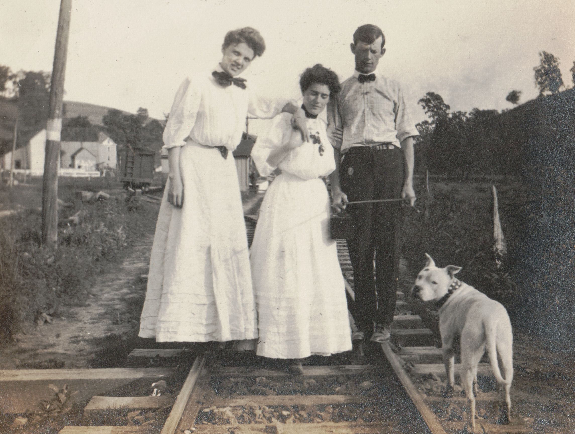 SOURCE CITATION: Greene County Album, Photo 11 - Irene (Ray) Jenkins [1882-1965] on far left, posing on the Waynesburg & Washington railroad tracks in Greene County, Pennsylvania; circa 1907; item no. GCHS-AN031-0002-0011, George David Jenkins Series, Greene County Historical Society Collection; Greene Connections Archives Project (GreeneConnections.com).