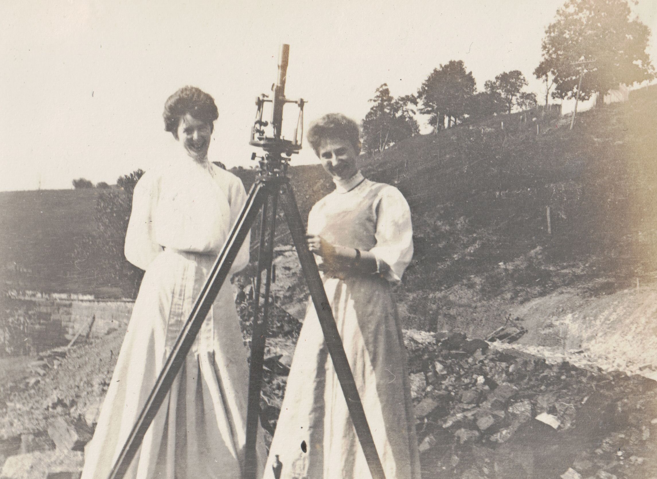 SOURCE CITATION: Greene County Album, Photo 18 - [Left-Right]: Anna Scott and Jessie Carter, posing with surveying equipment during road work in Greene County, Pennsylvania; circa 1907; item no. GCHS-AN031-0002-0018, George David Jenkins Series, Greene County Historical Society Collection; Greene Connections Archives Project (GreeneConnections.com).