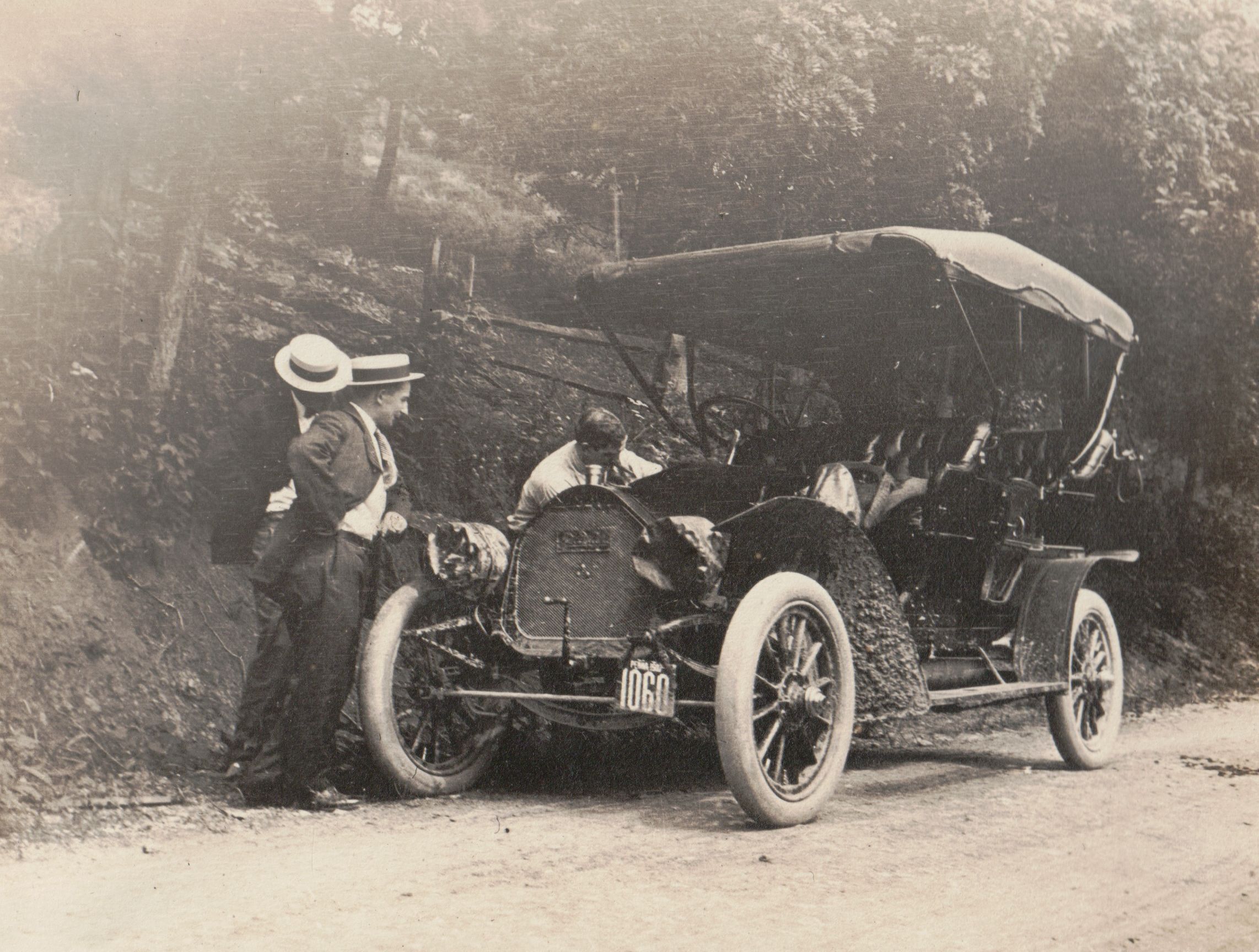 SOURCE CITATION: Greene County Album, Photo 20 - Car breakdown in Greene County, Pennsylvania; circa 1907; item no. GCHS-AN031-0002-0020, George David Jenkins Series, Greene County Historical Society Collection; Greene Connections Archives Project (GreeneConnections.com).