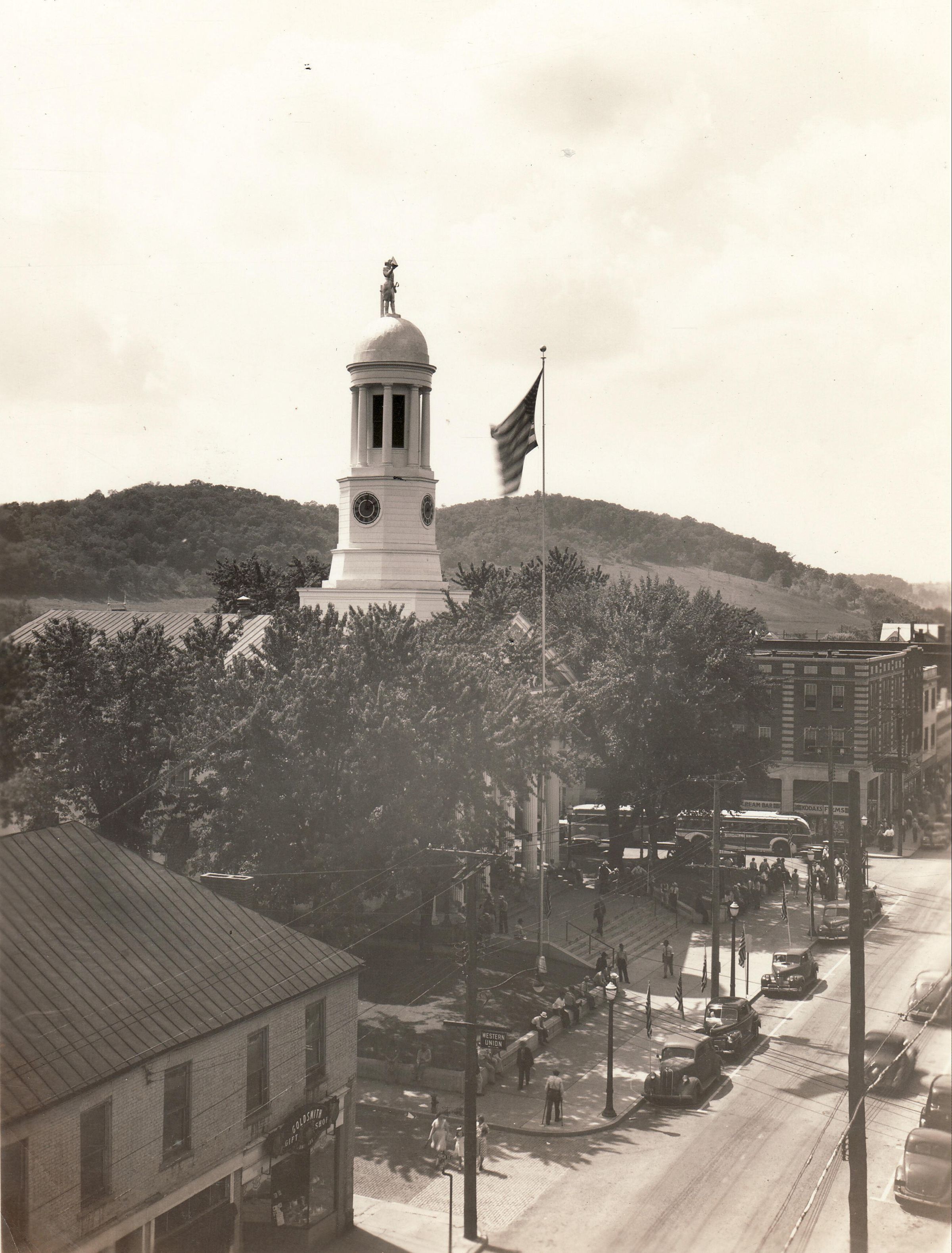 Automobiles, Flag--United States, Greene County Courthouse (Waynesburg, Pa.), Waynesburg (Pa.)--Business--Fort Jackson Hotel, Waynesburg (Pa.)--Streets--High StreetOther Names and Numbers