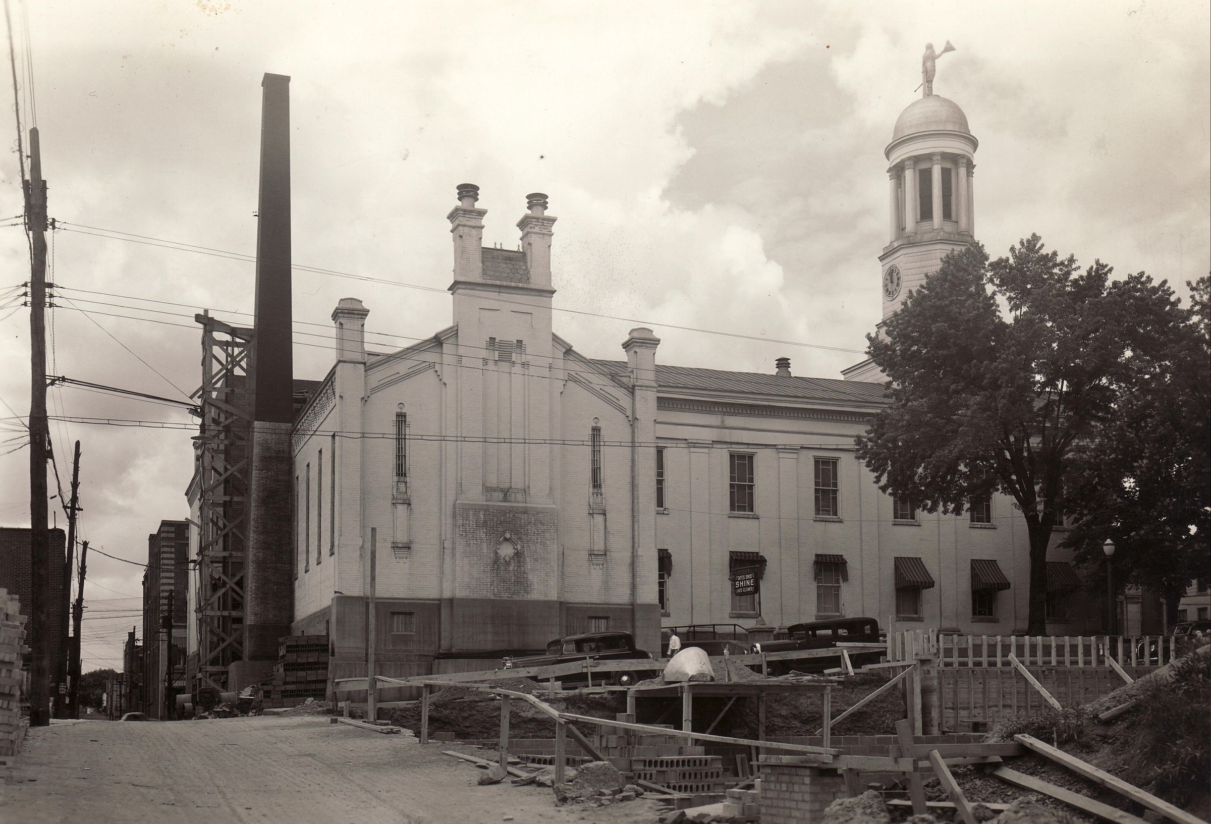 Greene County Courthouse and jail in Waynesburg, Greene County, Pennsylvania. This view is looking west from Morgan Street down Cherry Alley towards Church Street where the courthouse is located. On down the alley at the intersection of Washington Street, the edge of the Fort Jackson Hotel is visible.
