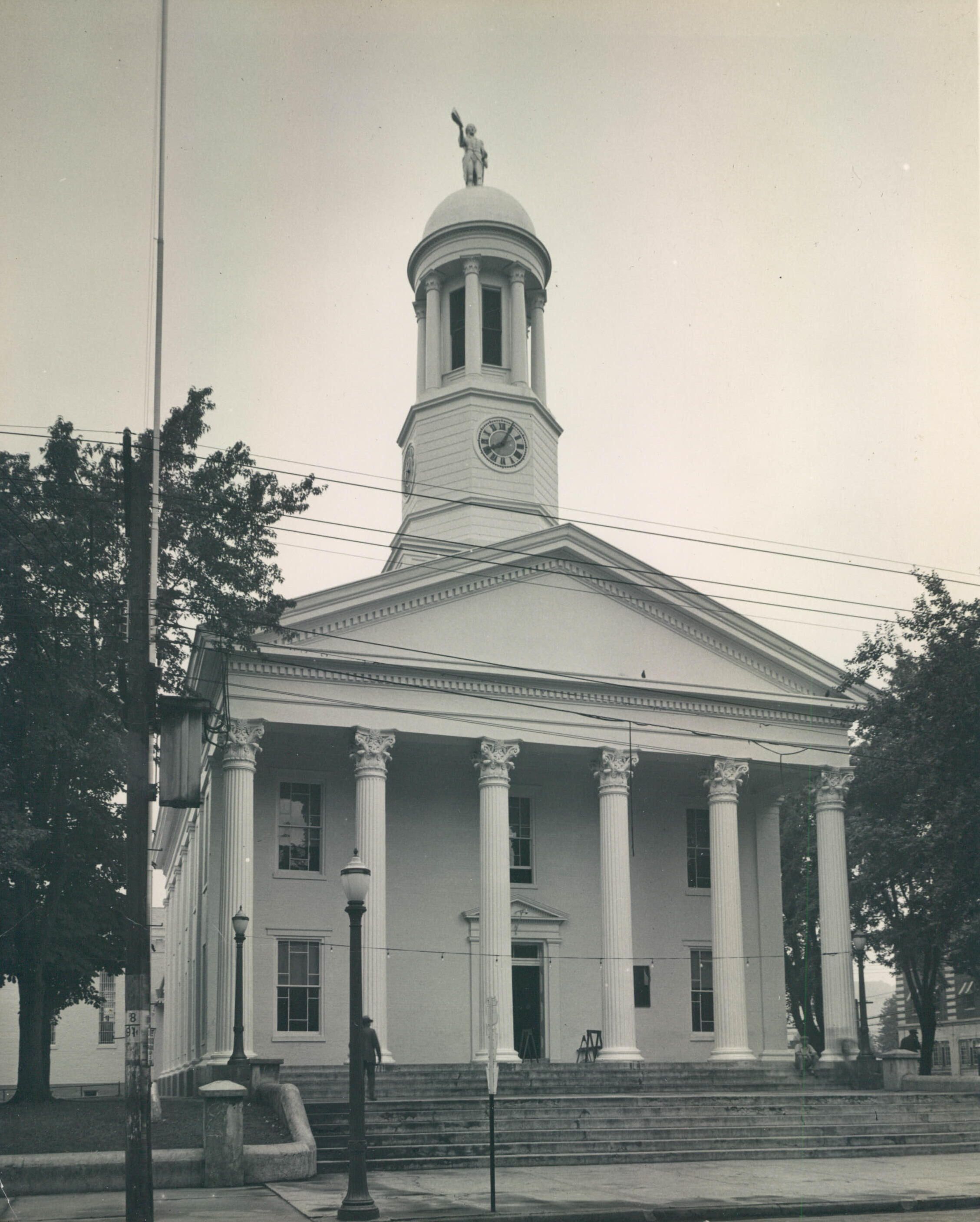 Source Citation: Greene County Courthouse on High Street in Waynesburg, Pennsylvania, photograph by William E. S. Fletcher, item no. CGSP_AN007_0006, Cornerstone Genealogical Society Collection, Greene Connections Archives Project (www.GreeneConnections.com).