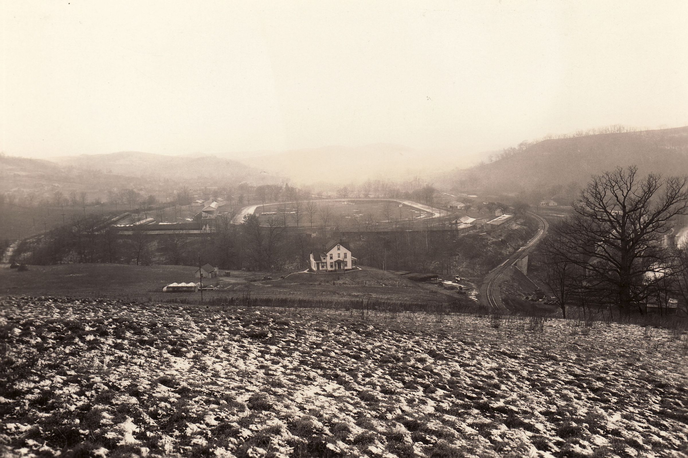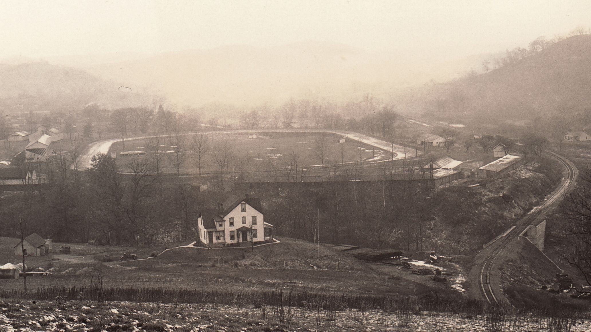 Looking west from the hilltop where the Rhodes Cemetery is located, near present day I-79, towards the Greene County Fairgrounds in Waynesburg, Pennsylvania. The grandstand (left) was completed in 1911.