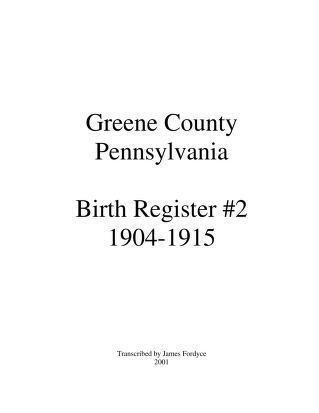 Contains a complete transcription of the records found in the second of two Birth Registers found in the Greene County Courthouse in Waynesburg, Pennsylvania. This book contains births recorded between 1904 and 1915. Includes a complete name index.Collection