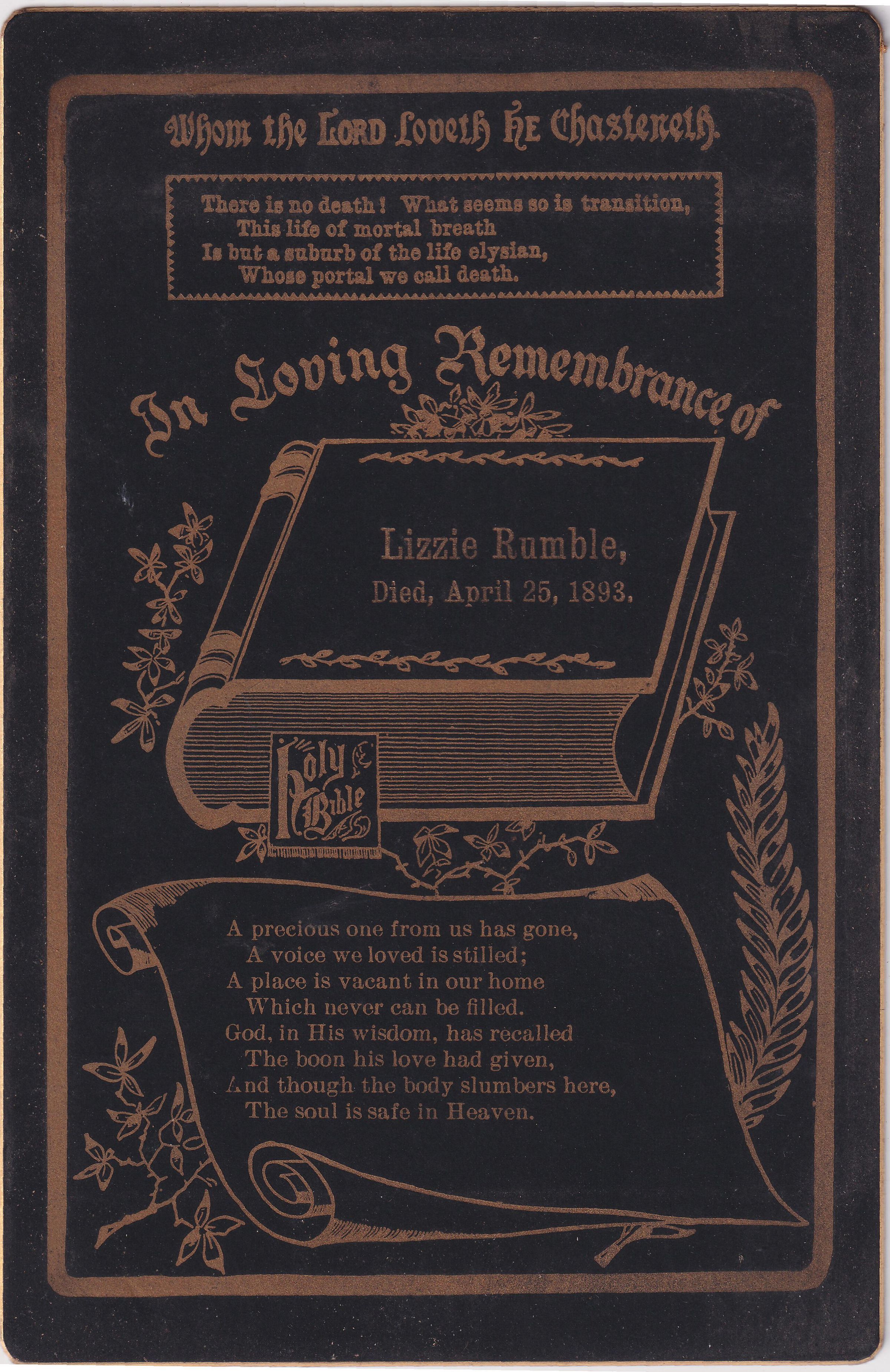 Source Citation: Greensboro Album 01, Photo 12 - Funeral card of Lizzie Rumble; dated 1893; item no. MONO-AN001-0012, Monon Center Collection, Greene Connections: Greene County, Pennsylvania Archives Project (www.GreeneConnections.com).