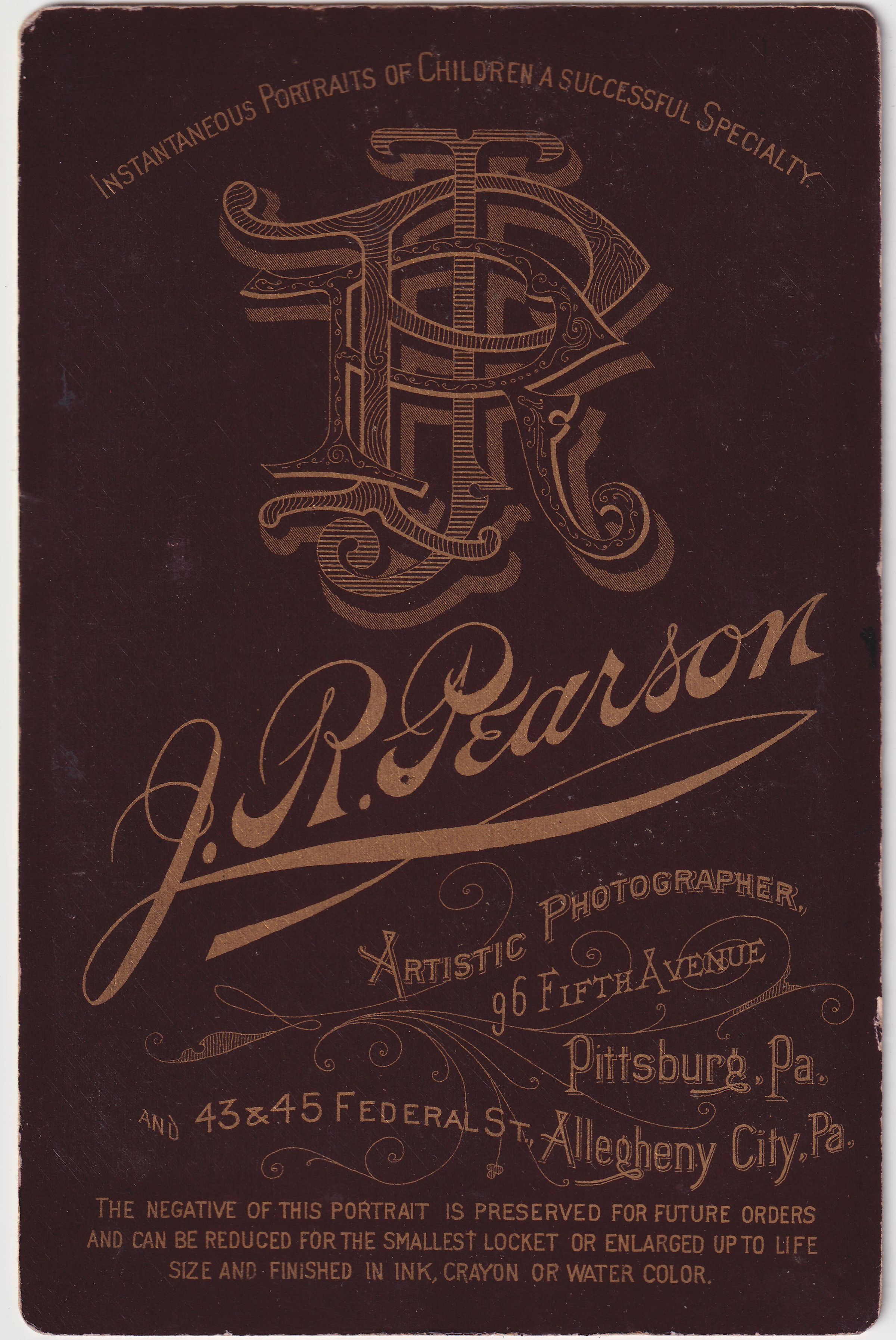 Greensboro Album 01 is a cabinet card size photograph album. It was archived at the Monon Center and shared with the Greene Connections: Greene County, Pennsylvania Archives Project for digital preservation and access in 2021. No provenance or ownership history is known, but items included mention the Rumble and Vance families; photographs that have been identified based on comparison to other known images, include the Birch and Jones families; and photographer stamps strongly represent Greensboro in Monongahela Township, Greene County, Pennsylvania, as well as several nearby communities.