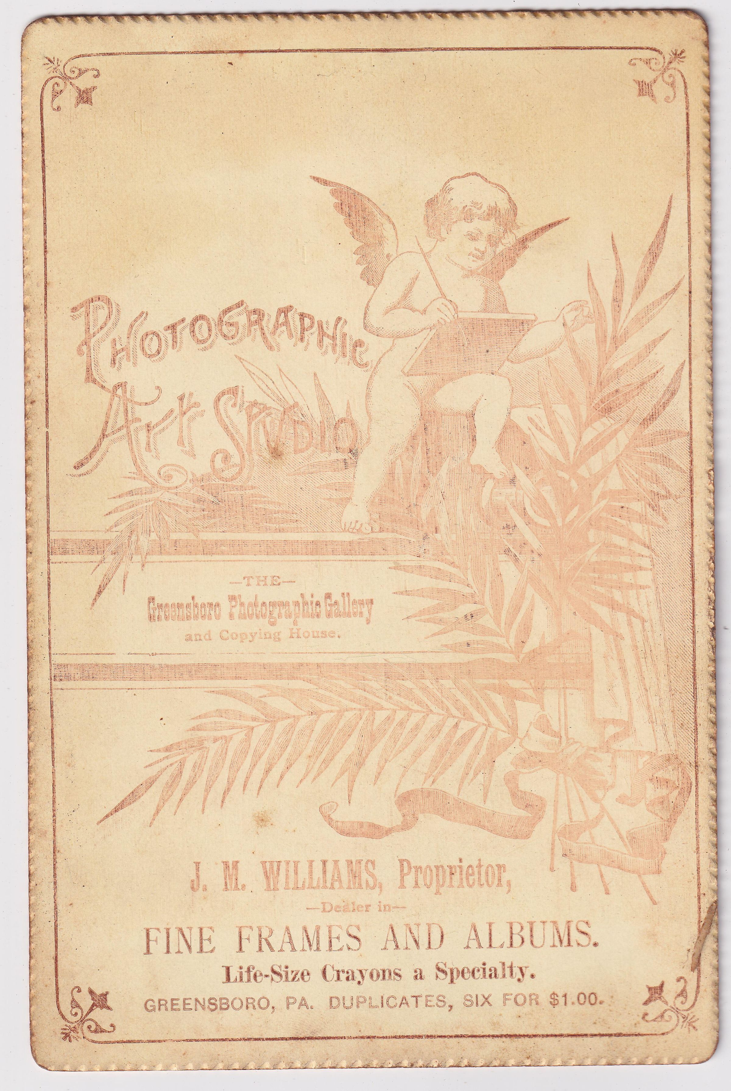 Greensboro Album 01 is a cabinet card size photograph album. It was archived at the Monon Center and shared with the Greene Connections: Greene County, Pennsylvania Archives Project for digital preservation and access in 2021. No provenance or ownership history is known, but items included mention the Rumble and Vance families; photographs that have been identified based on comparison to other known images, include the Birch and Jones families; and photographer stamps strongly represent Greensboro in Monongahela Township, Greene County, Pennsylvania, as well as several nearby communities.