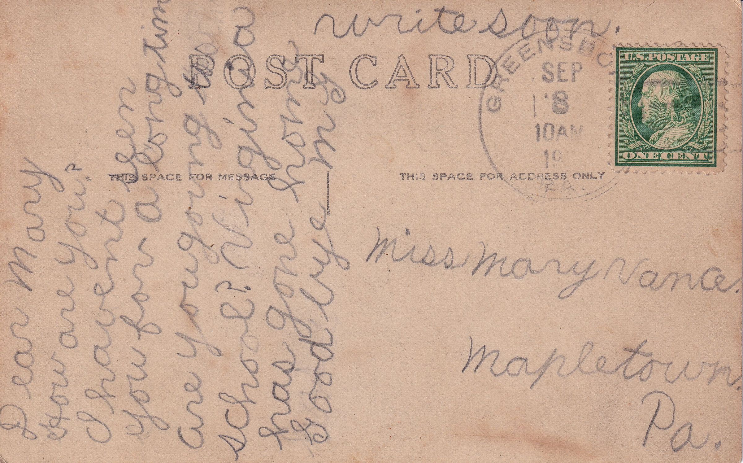 The Mary (Vance) McCann Collection was passed from George Birch Vance [1870-1928] and Jessie Dell (McFarland) Vance [1868-1935] with the ownership of their home in Mapletown, Monongahela Township, Greene County, Pennsylvania, to their daughter, Mary (Vance) McCann [1898-1987], and her husband, Marshall Albert McCann [1895-1956]. Mary (Vance) McCann left the collection to her grandson, William Marshall Miller, who owned and shared the collection with the Greene Connections: Greene County, Pennsylvania Archives Project in 2023.
