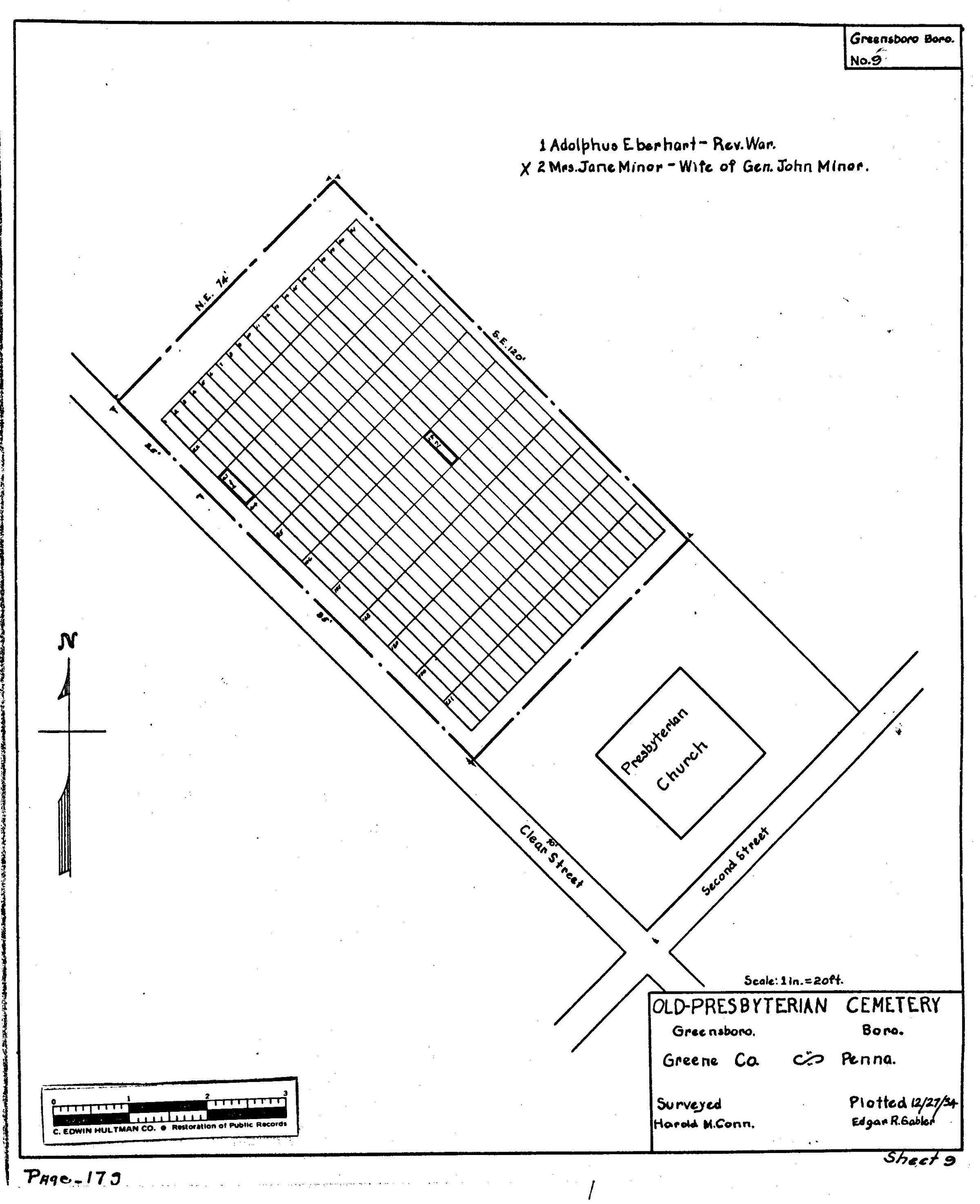 SOURCE CITATION: WPA Cemetery Plat - Pennsylvania - Greene County - Monongahela Township - Greensboro Presbyterian Church Cemetery (1934); item no. 2016.3.368, Cemetery Plat (WPA) Collection, surveyed by Works Projects Administration, copy on file at the Clerk of Courts Office, Greene County Courthouse; Greene Connections Archives Project (GreeneConnections.com).