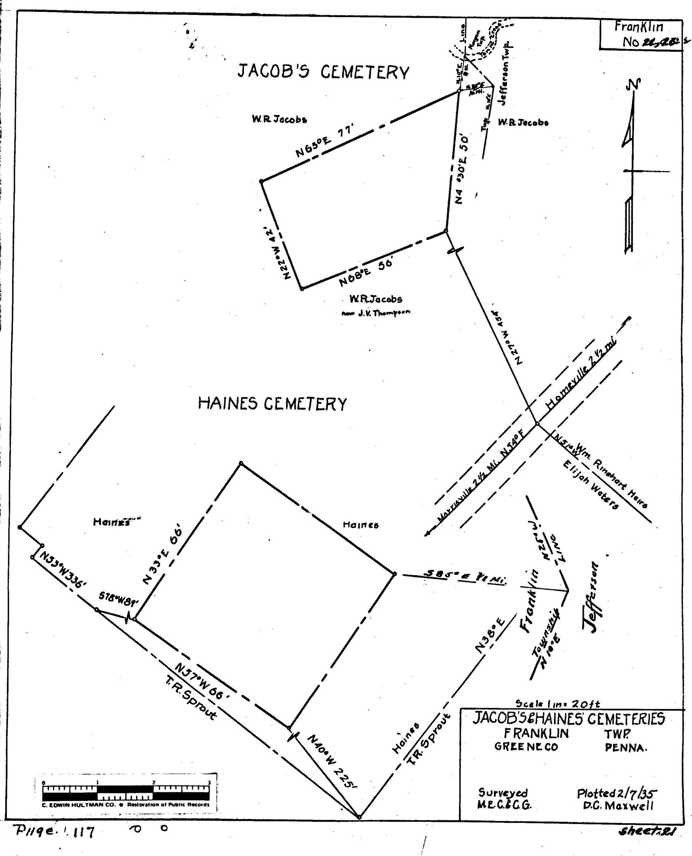 SOURCE CITATION: WPA Cemetery Plat - Pennsylvania - Greene County - Franklin Township - Haines Cemetery (1935), item no. 2016.3.137, Cemetery Plat (WPA) Collection, surveyed by Works Projects Administration, copy on file at the Clerk of Courts Office, Greene County Courthouse, Greene Connections Archives Project (www.GreeneConnections.com).