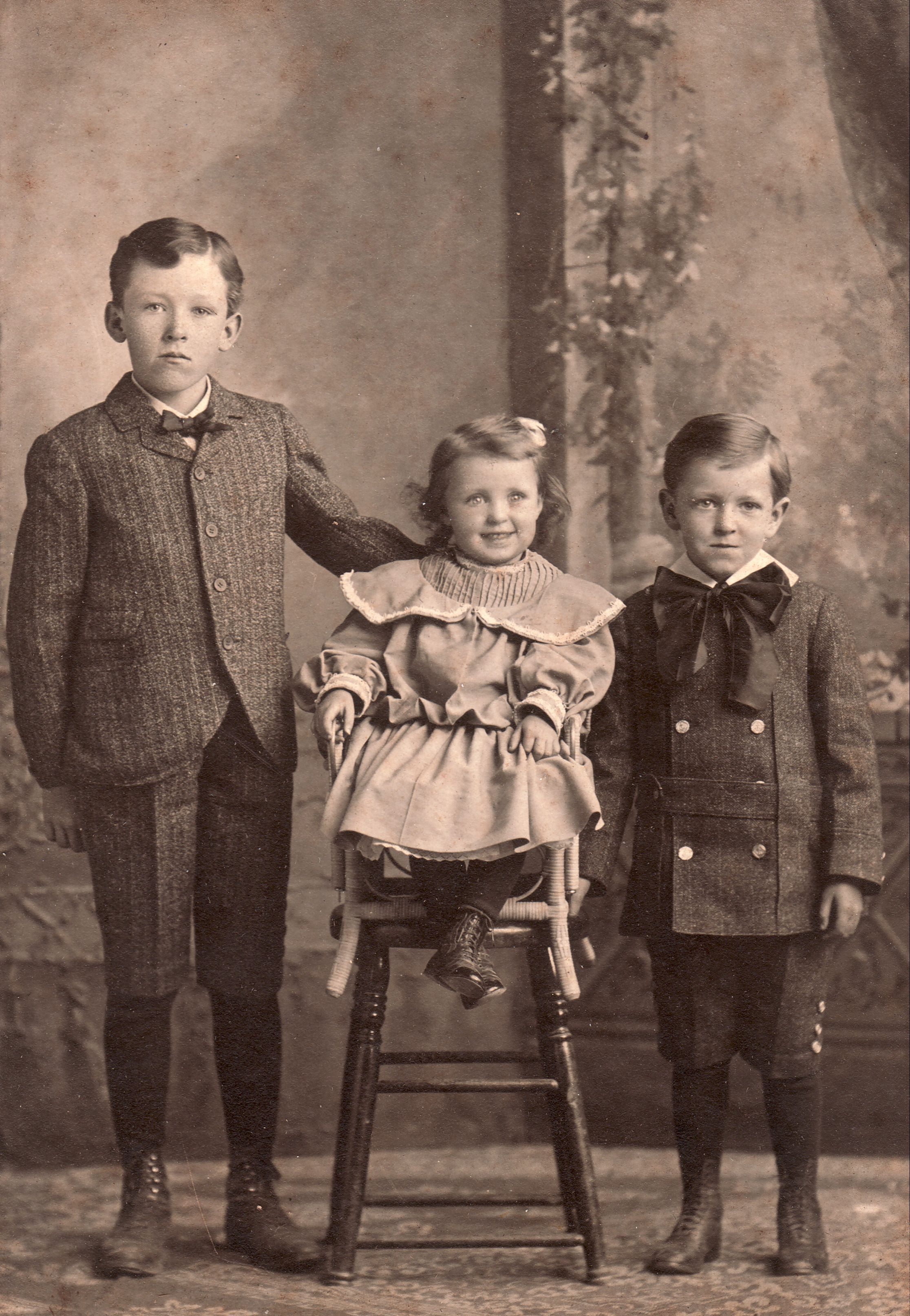 SOURCE CITATION: [Left-Right]: Samuel Morris Thompson [1893-1952], Kathleen Thompson [1901-1924], Jesse Harold Thompson [1899-1972] - children of Harvey Call Thompson and Anna May Morris (Caption reads, "Kate, Jess, Morris - Thomas. Papap's cousins"); circa 1900-1905, image by Rogers & Weaver, Waynesburg, Pa.; item no. SMIT-AN001-0019, Carrie Belle (Stewart) Smith Collection, shared by Amy Smith; Greene Connections Archives Project (GreeneConnections.com).