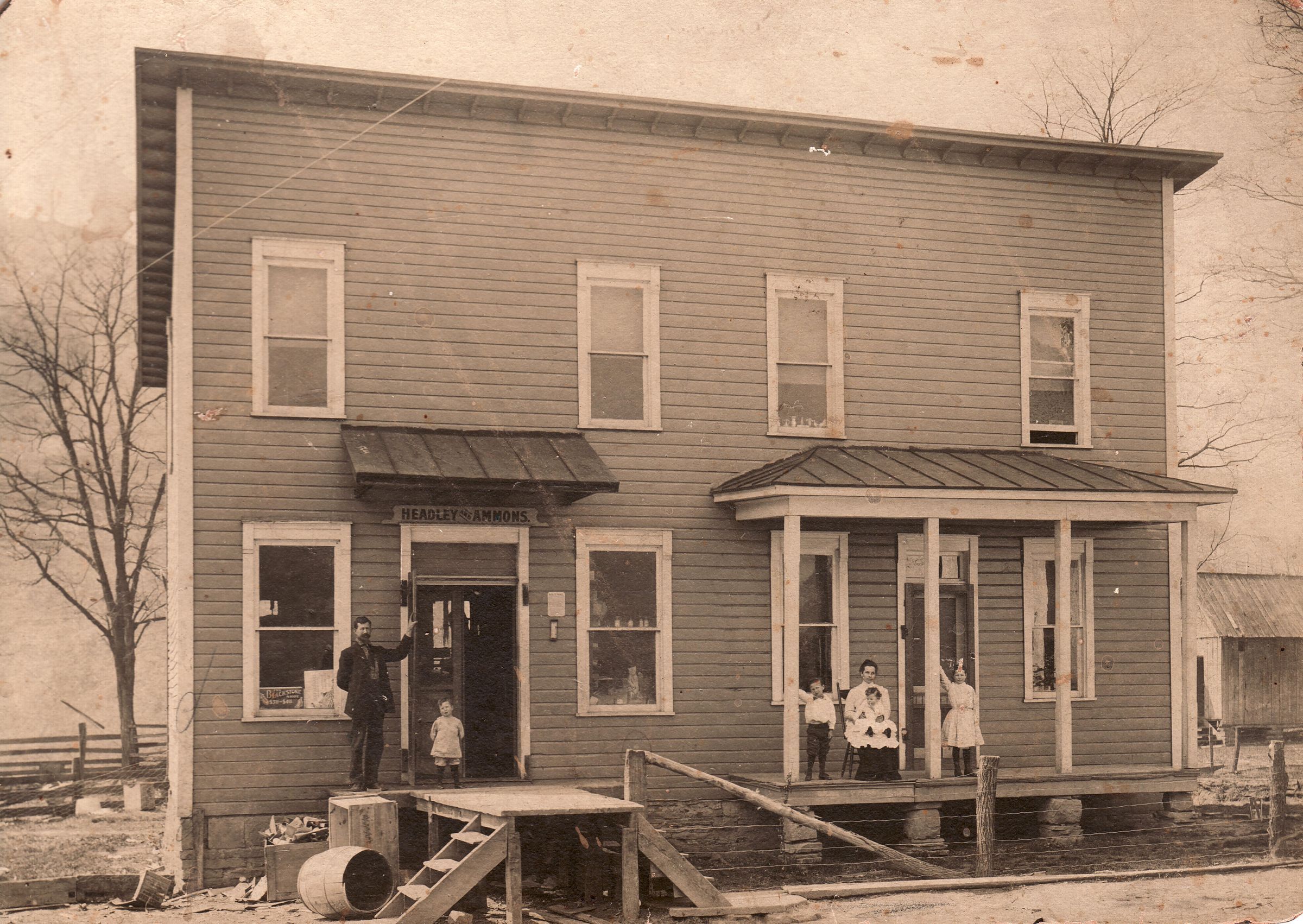 Source Citation: Headley and Ammons Store (left) and Headlee home (right) in Brock, Wayne Township, Greene County, Pennsylvania; circa 1909-1910; item no. STEW-AN001-0002, Headlee Series, Carl Headlee Collection, Greene Connections Archives Project (www.GreeneConnections.com).