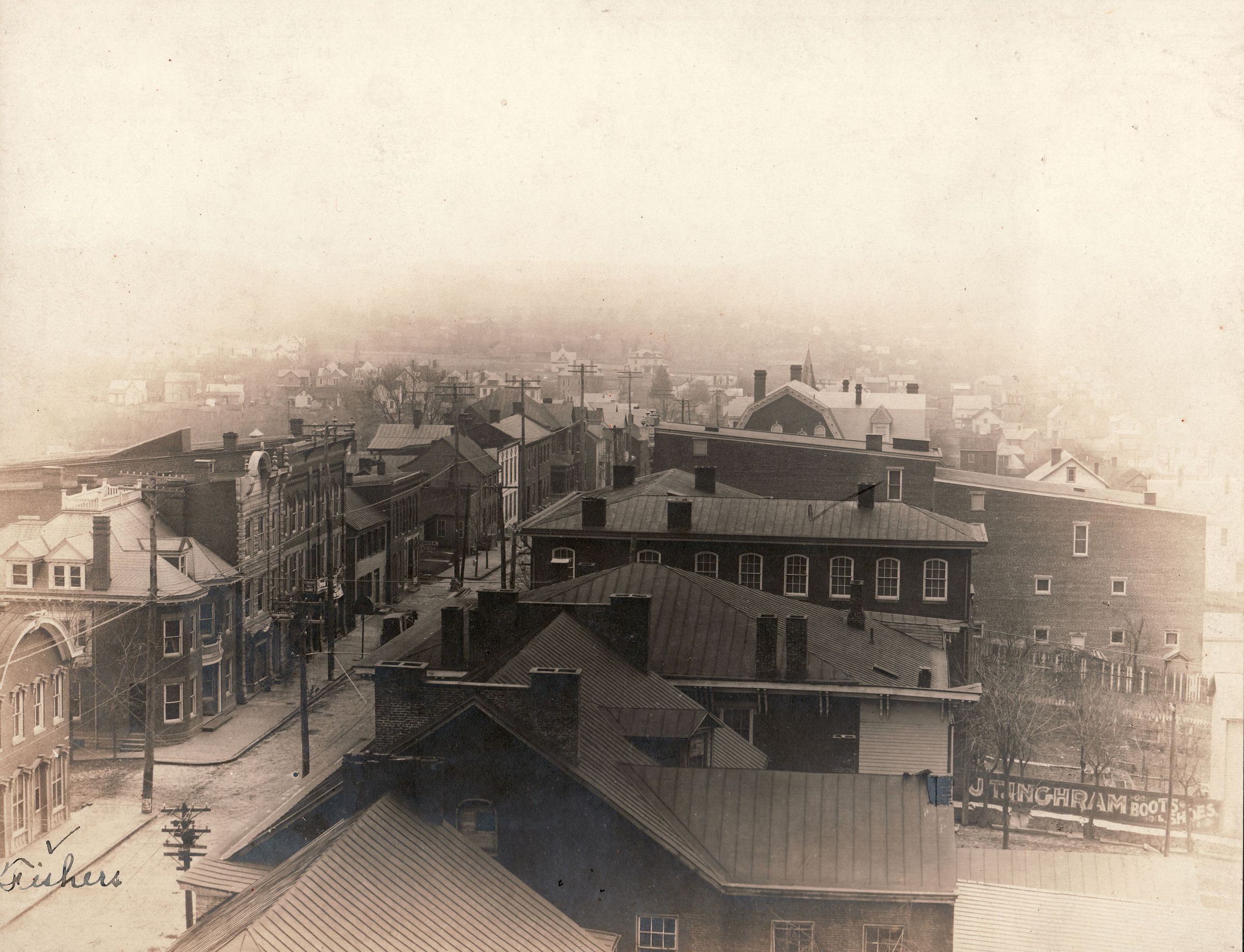 Probably photographed from the courthouse cupola, this view shows High Street between Morgan and Cumberland Streets.
