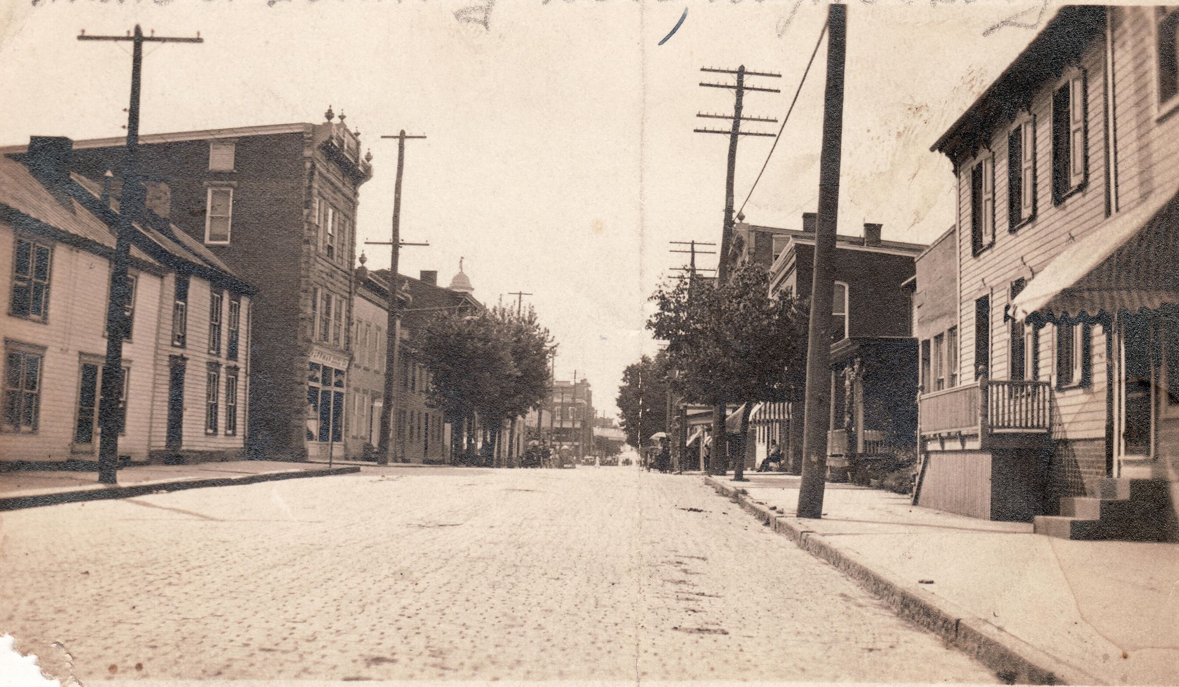 Source Citation: High Street (looking west from near Cumberland Street) in Waynesburg, Greene County, Pennsylvania, item no. CROU-AN005-0002, Scott and Teresa (Crouse) Roberts Collection, Greene Connections Archives Project (GreeneConnections.com).