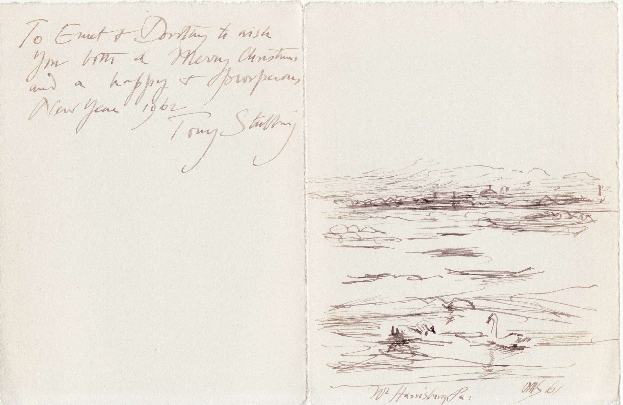 SOURCE CITATION: Holiday card sent from Newton Hadyn "Tony" Stubbing [1921-1983] to Emmett Foster Cary [1893-1980] and his wife, Dorothy Simpson (Minor) Cary [1894-1969]; dated 1961-1962; item no. CARY-AN001-0002, Miller Series, Margaret Minor (Cary) Smith Collection; Greene Connections Archives Project (GreeneConnections.com).