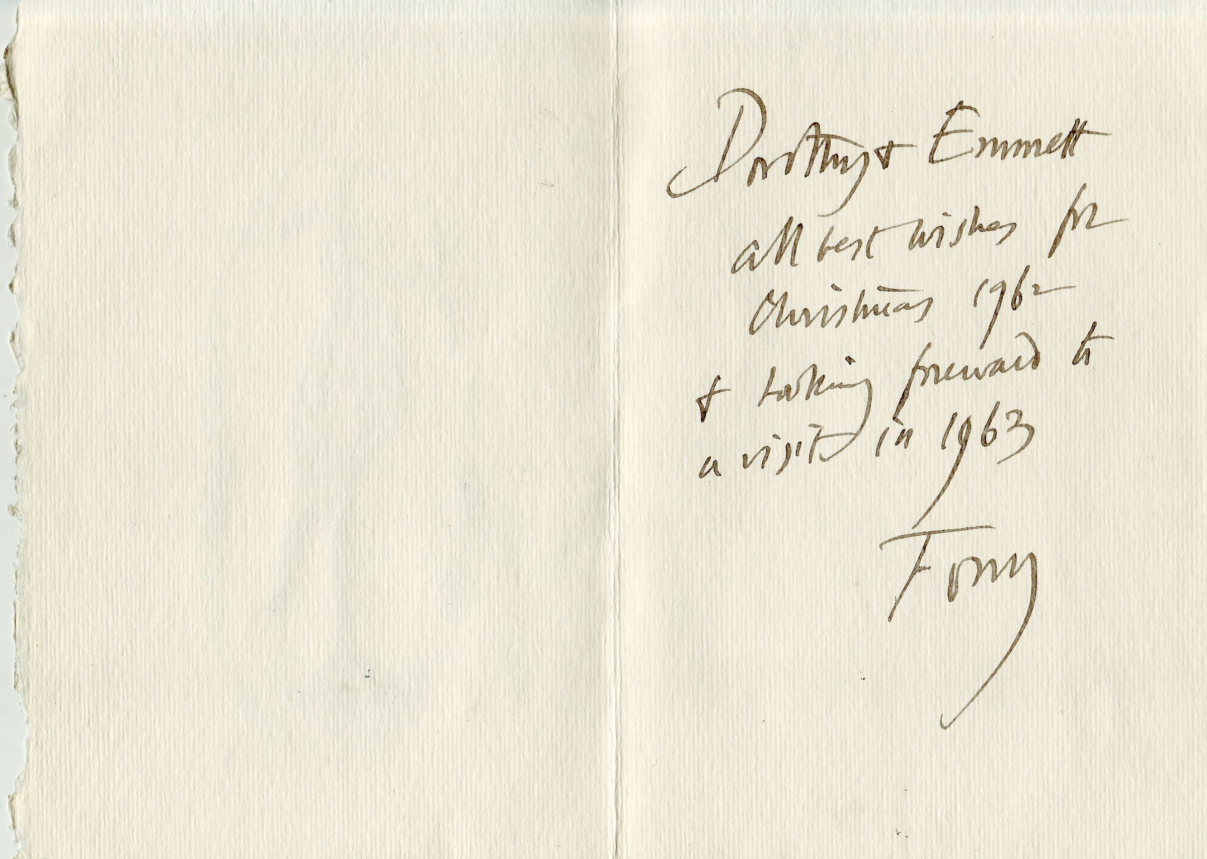 SOURCE CITATION: Holiday card sent from Newton Hadyn "Tony" Stubbing [1921-1983] to Emmett Foster Cary [1893-1980] and his wife, Dorothy Simpson (Minor) Cary [1894-1969]; dated 1962-1963; item no. CARY-AN001-0003, Miller Series, Margaret Minor (Cary) Smith Collection; Greene Connections Archives Project (GreeneConnections.com).