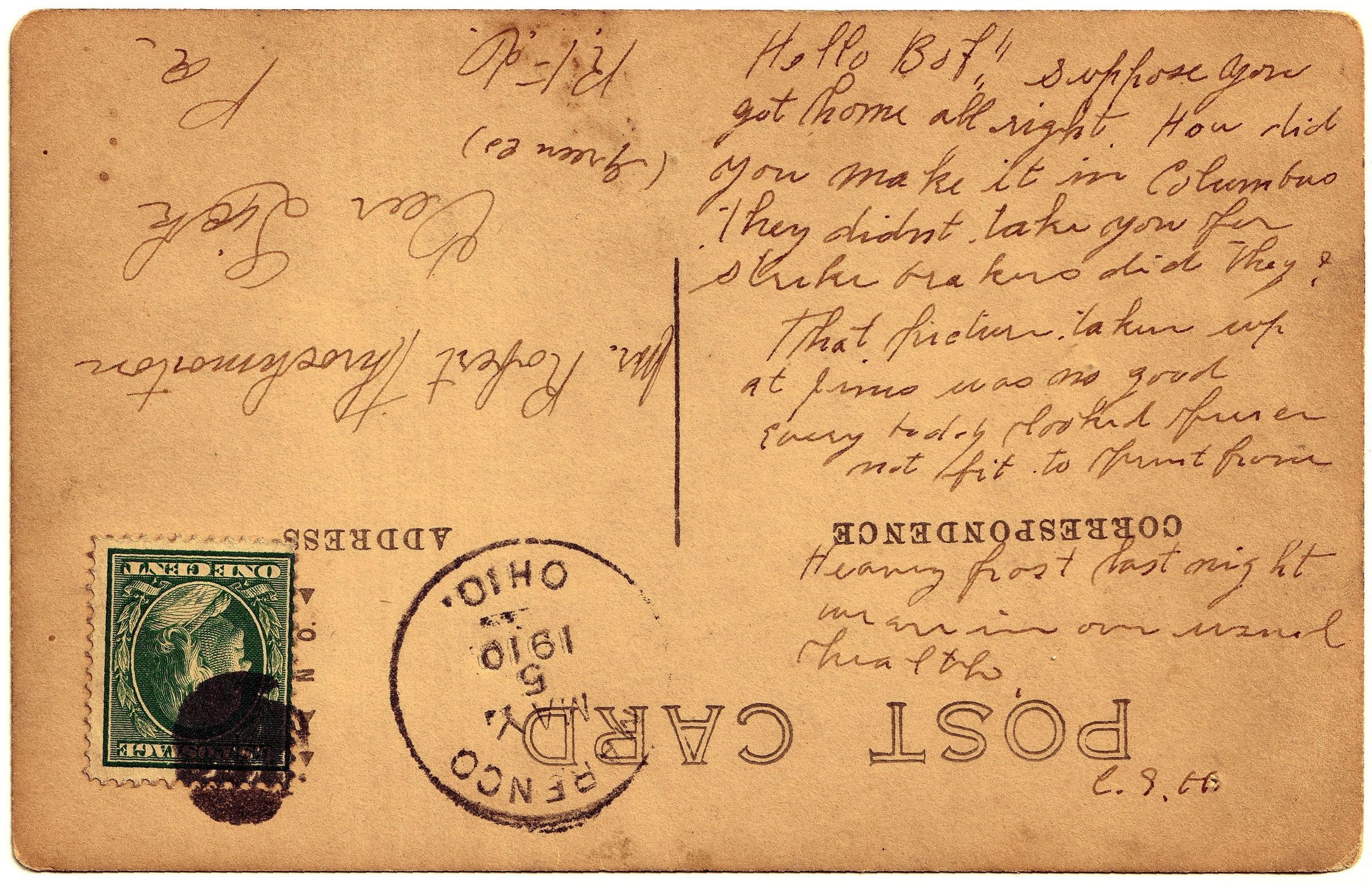SOURCE CITATION: Charles S. Hopkins (Marengo, Morrow County, Ohio) to his first cousin, Robert Lawrence Throckmorton Sr. (Deer Lick, Greene County, Pennsylvania), postcard, 5 May 1910; item no. TOOG-AN001-0002-0023, Throckmorton Series, Glenn Jacob Roy Thornton Toothman III Collection; Greene Connections Archives Project (GreeneConnections.com).