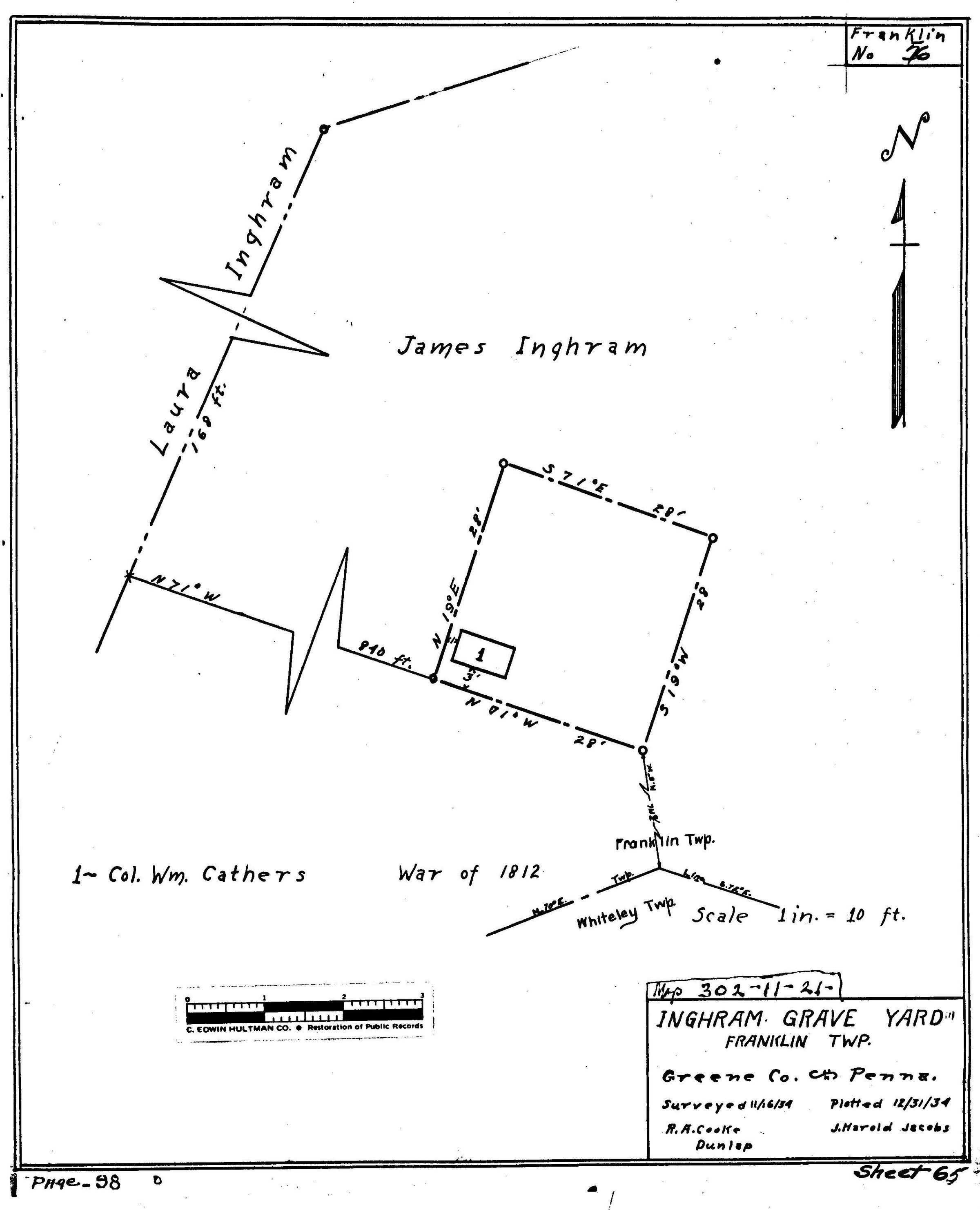SOURCE CITATION: WPA Cemetery Plat - Pennsylvania - Greene County - Franklin Township - Inghram Cemetery II (1934), item no. 2016.3.141, Cemetery Plat (WPA) Collection, surveyed by Works Projects Administration, copy on file at the Clerk of Courts Office, Greene County Courthouse, Greene Connections Archives Project (www.GreeneConnections.com).