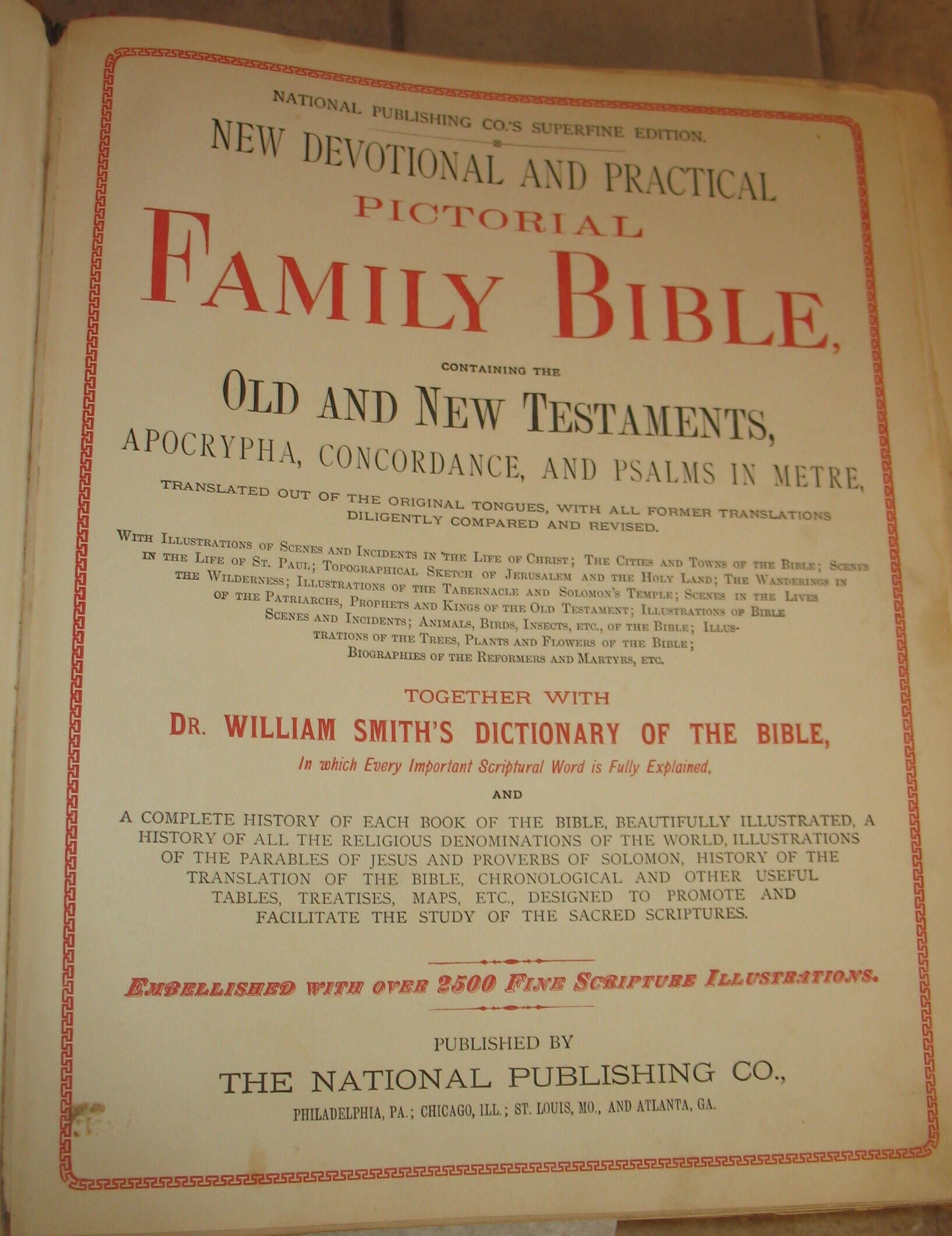 J. H. and Elizabeth (Throckmorton) Wood family bible records (including photographs and family papers), 1842-1958, "New Devotional and Practical Pictorial Family Bible," Superfine edition (Philadelphia, Pa., Chicago, Ill., St. Louis, Mo., and Atlanta, Ga.: National Publishing Co., no date); privately held by Bill Anderson, Vancouver, WA, 2012. Passed from Rev. John Harrison Wood [1842-1928] and his wife, Elizabeth Throckmorton [1842-1931], to their son Isaac T. Wood [1862-1946] and his wife, Minnie Hayden, to their daughter Alta (Wood) McCormick, to her cousin Edna (Wood) White, to her daughter Ethel (White) Anderson, to her son Bill Anderson who owned and shared the Bible and its contents with the Greene Connections: Greene County, Pennsylvania Archives Project in 2012.
