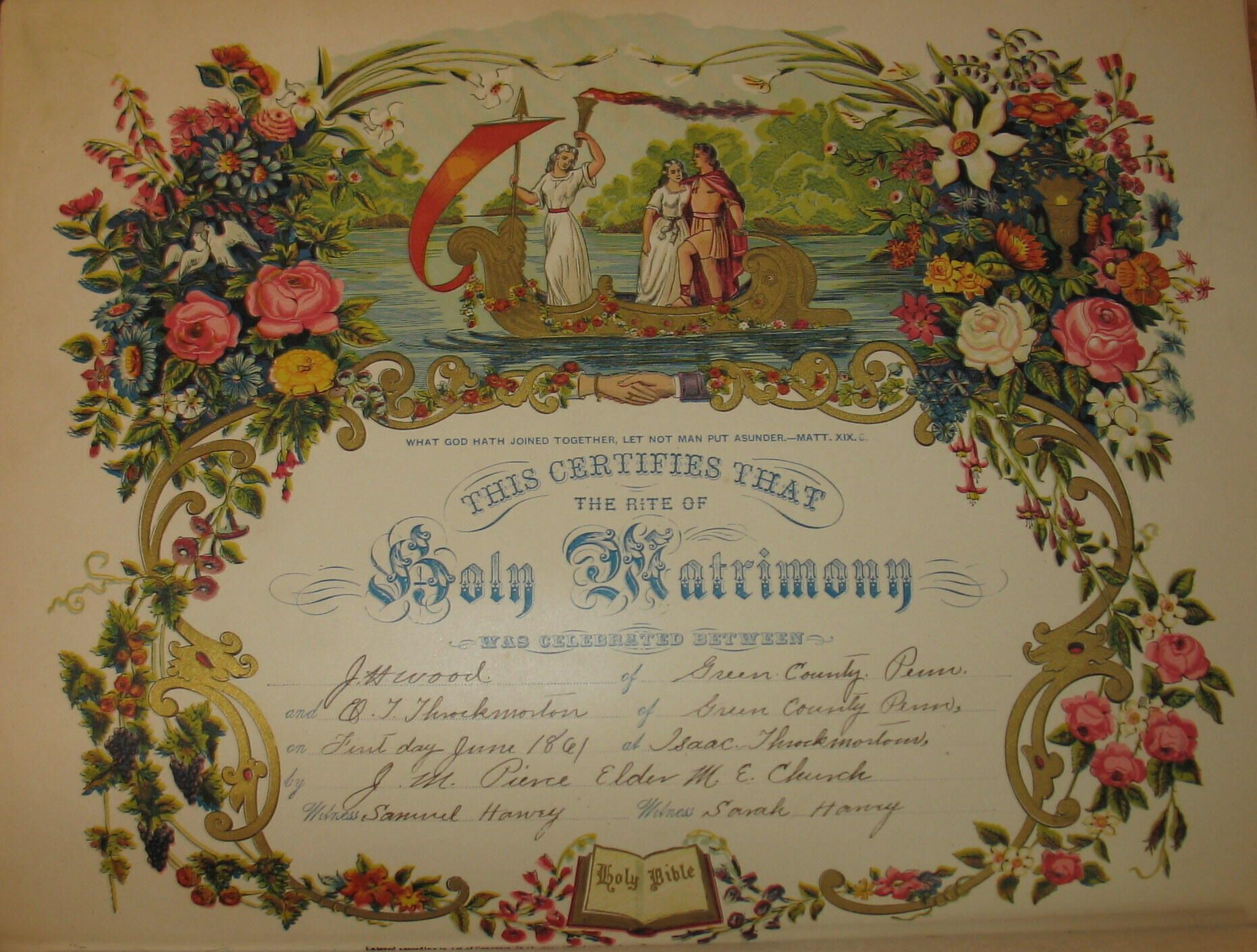 "This Certifies That / The Rite Of / Holy Matrimony / Was Celebrated Between / J. H. Wood of Green[e] County Penn. / and E. J. Throckmorton of Green[e] County Penn. / on First day June 1861 at Isaac Throckmorton[']s / by J. M. Pierce Elder M. E. Church / Witness: Samuel Harvey / Witness: Sarah Harvey."