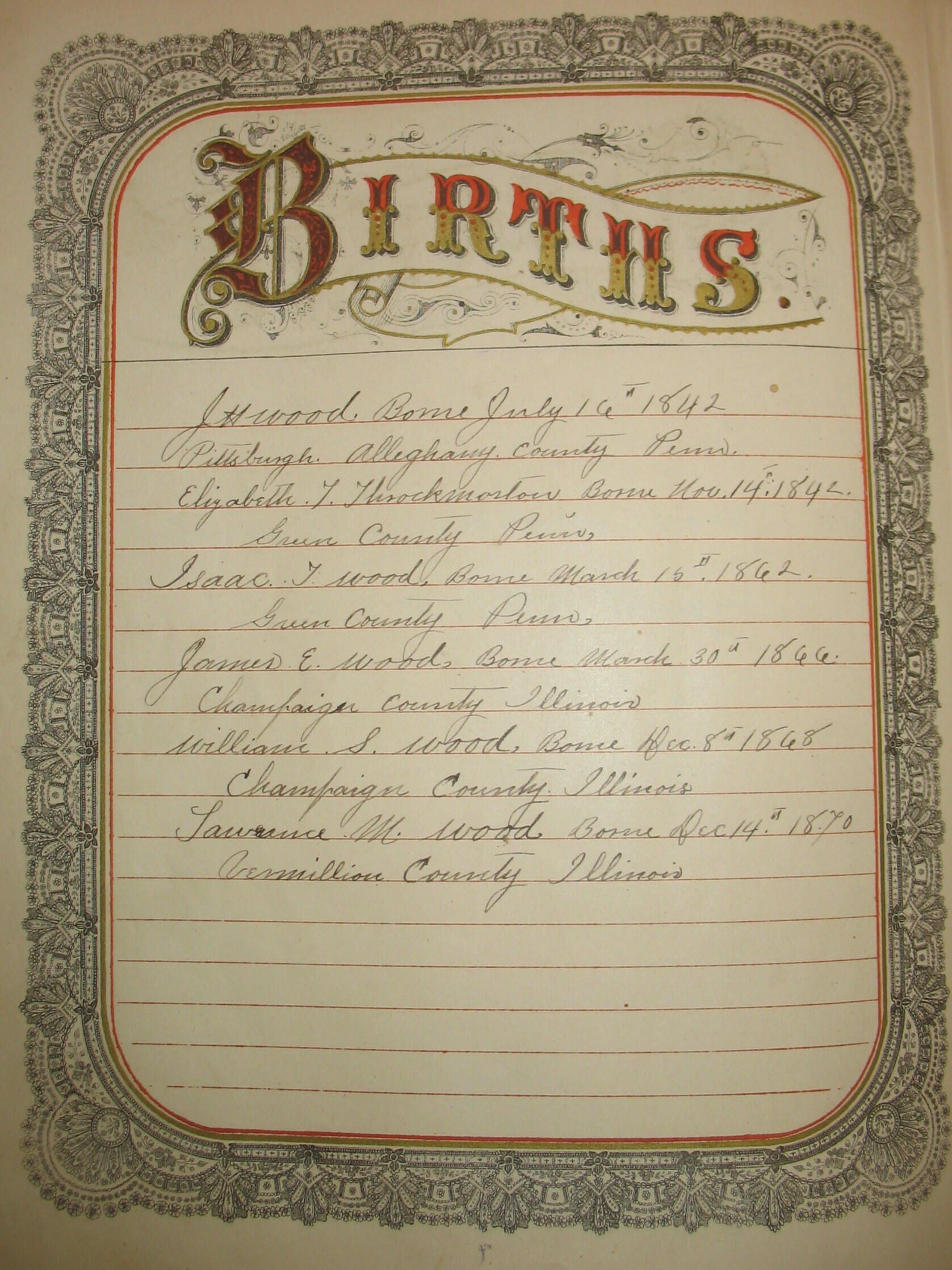 "J. H. Wood Borne [sic] July 16th 1842 / Pittsburgh Allegheny County Penn.