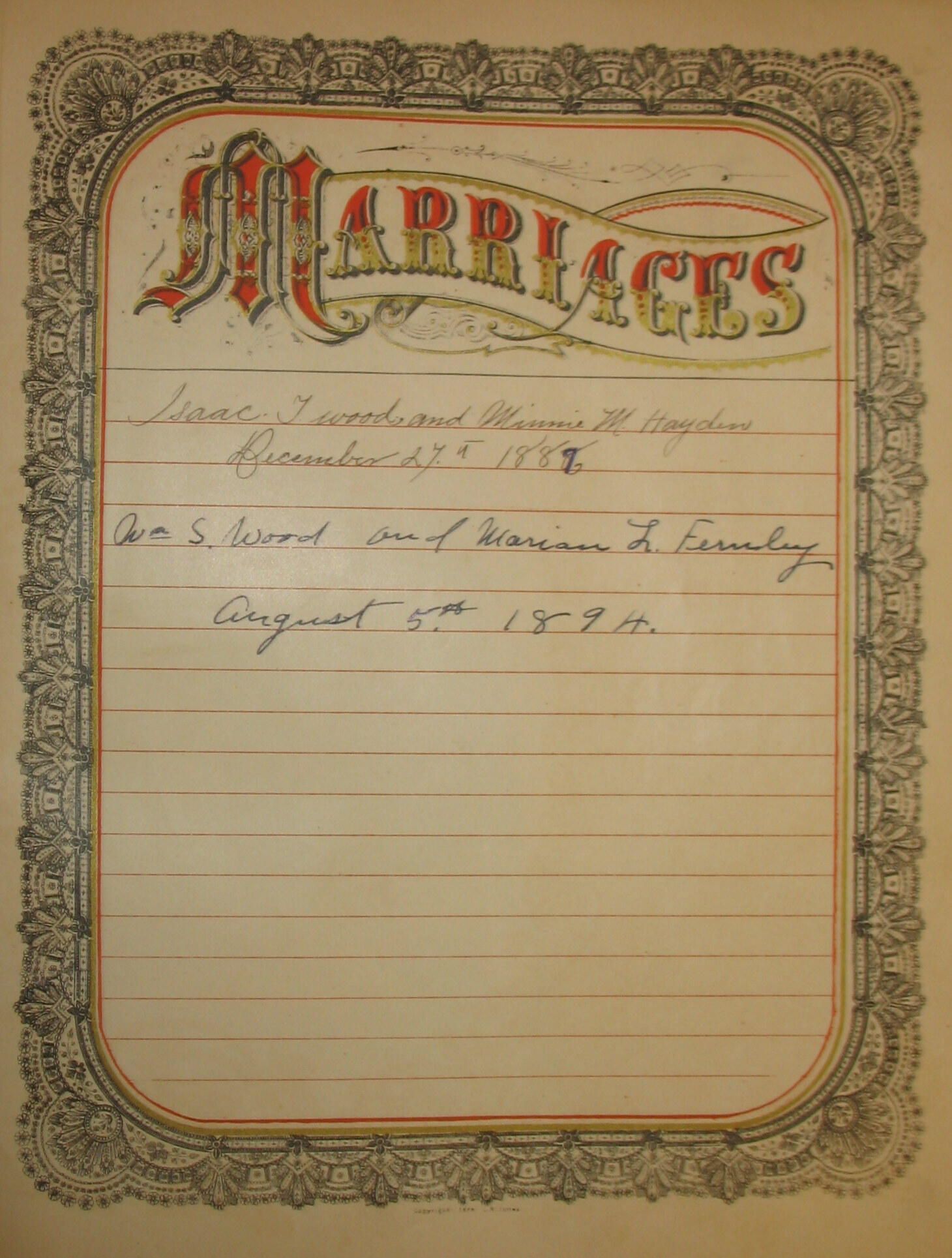 "Isaac T. Wood and Minnie M. Hayden / December 27th 1888 [1888 written over in later ink to say 1887]