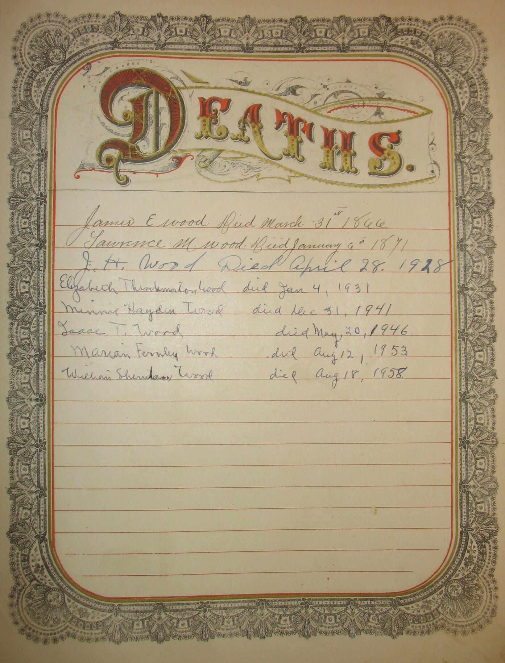 Wood, James E. [1866-1866], Harvey, Samuel [1820-1908], Wood, Lawrence M. [1870-1871], Wood, John Harrison [1842-1928], Throckmorton, Sarah Inghram [1829-1902], Throckmorton, Elizabeth J. [1842-1931], Femley, Marian [-1953], Hayden, Minnie [-1941], Wood, Isaac T. [1862-1946], Wood, William Sheridan [1868-1958], Throckmorton, Isaac [1806-1883]Provenance