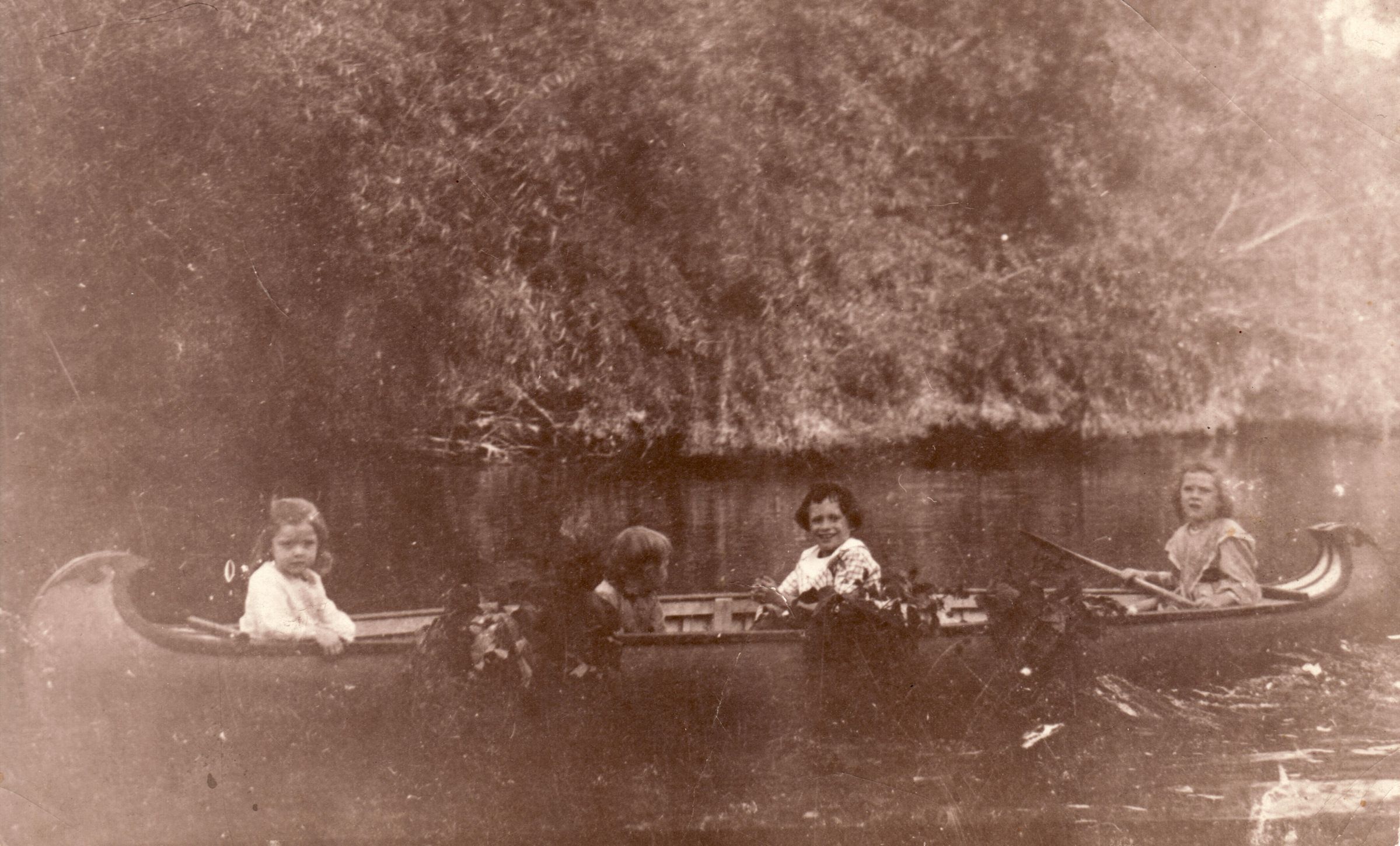 Source Citation: Jacobs and Brooks children in canoe on Ten Mile Creek; item no. JACB_AN001_0152, Helen Mae (Jacobs) Fonner Collection, shared by George and Anna (Fonner) Blystone; Greene Connections Archives Project (GreeneConnections.com).