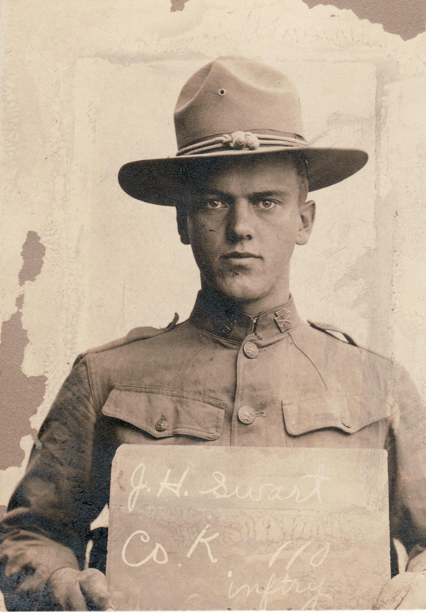 SOURCE CITATION: James Hobart Swart [1896-1918], Corporal - Company K, 110th Infantry, 28th Division - World War I - Killed in action 28 September 1918, Varennes-en-Argonne, Lorraine, France - son of James Henry Swart and Nancy Virginia Scott; circa 1917-1918; item no. SUPL-AN003-0017, Swart Series, Wayne Carl Swart Collection, Greene Connections Archives Project (www.GreeneConnections.com).