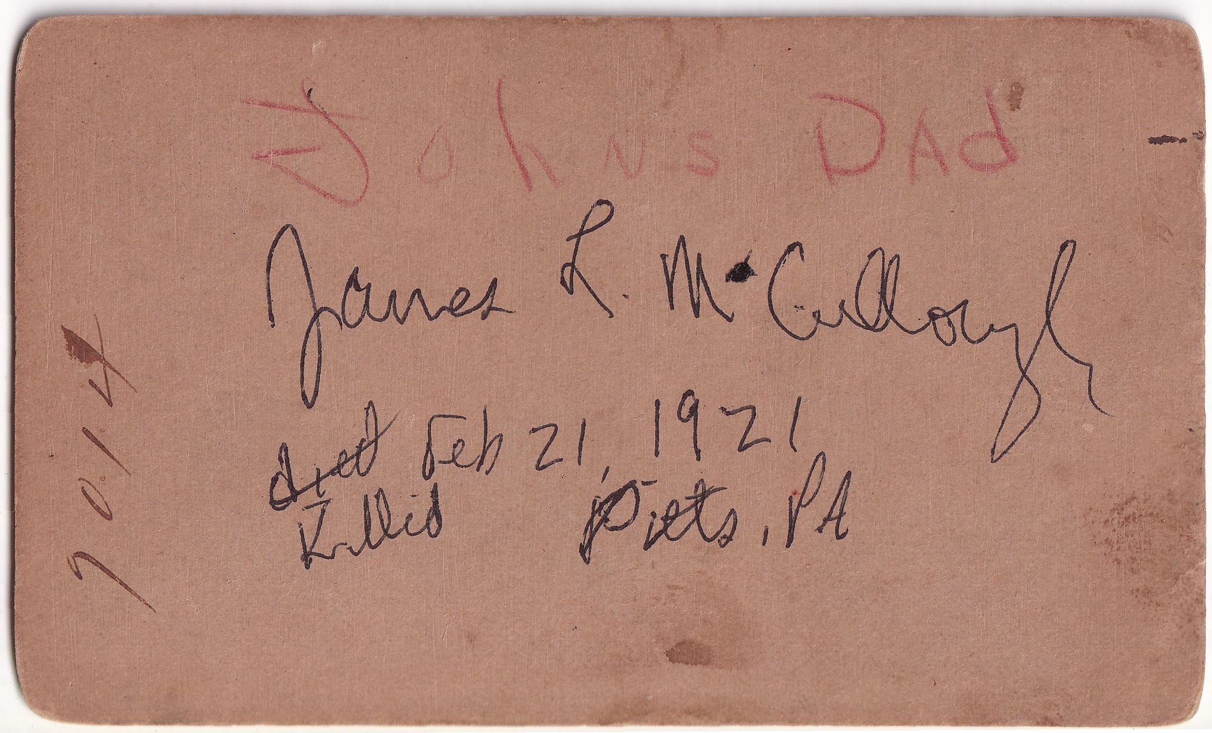 Handwritten inscription on reverse of image reads, "James L. McCullough / killed Feb 21 [sic 26], 1921 Pitts[bugh], PA.]. In another hand, a second inscription reads, "John's Dad."