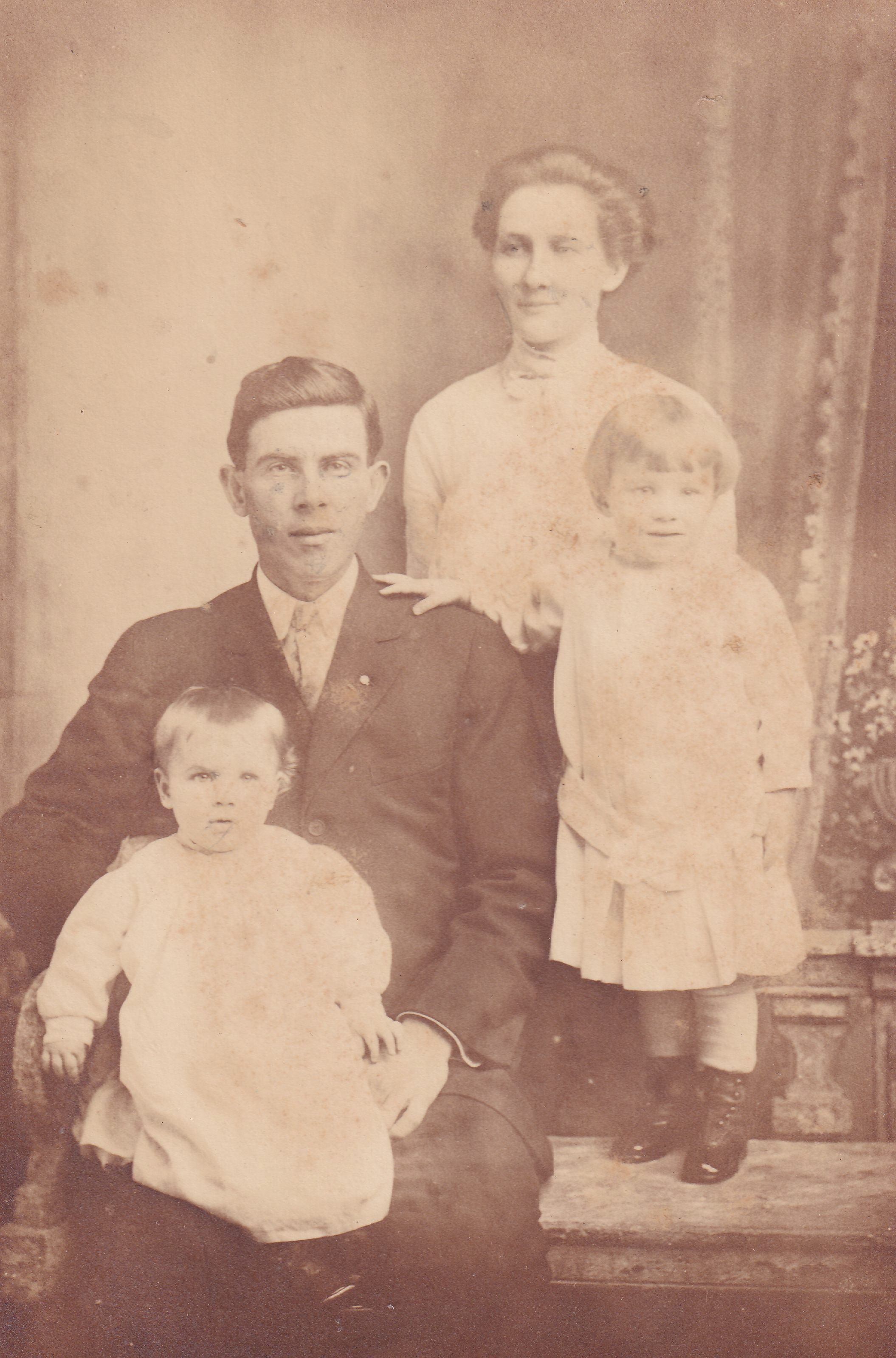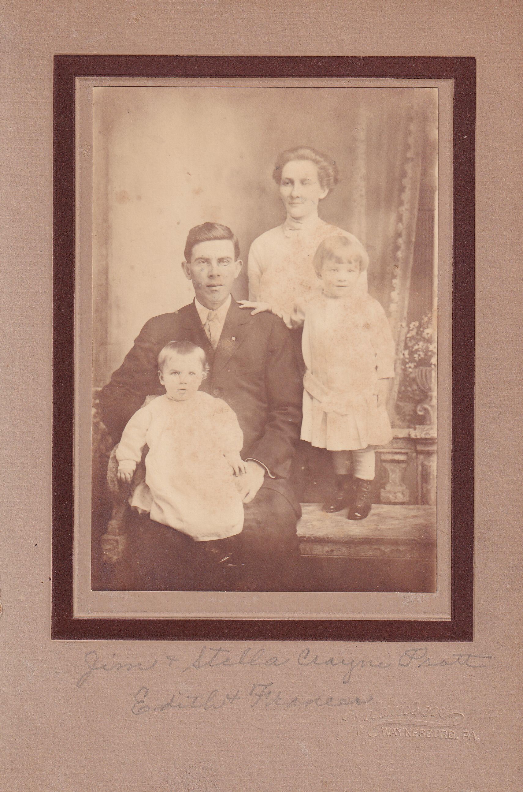 Source Citation: James Pratt [1886-1963] and his wife, Estella (Crayne) Pratt [1886-1959], with their daughters [Left-Right] Frances Pratt [1913-1997] and Edith Elizabeth Pratt [1911-1975]; circa 1913-1915, image by Adamson, Waynesburg, Pa.; item no. AULD-AN001-0010, Pratt Series, Pratt-Auld Collection, shared by Julia Kathryn Johnson, Greene Connections Archives Project (www.GreeneConnections.com).