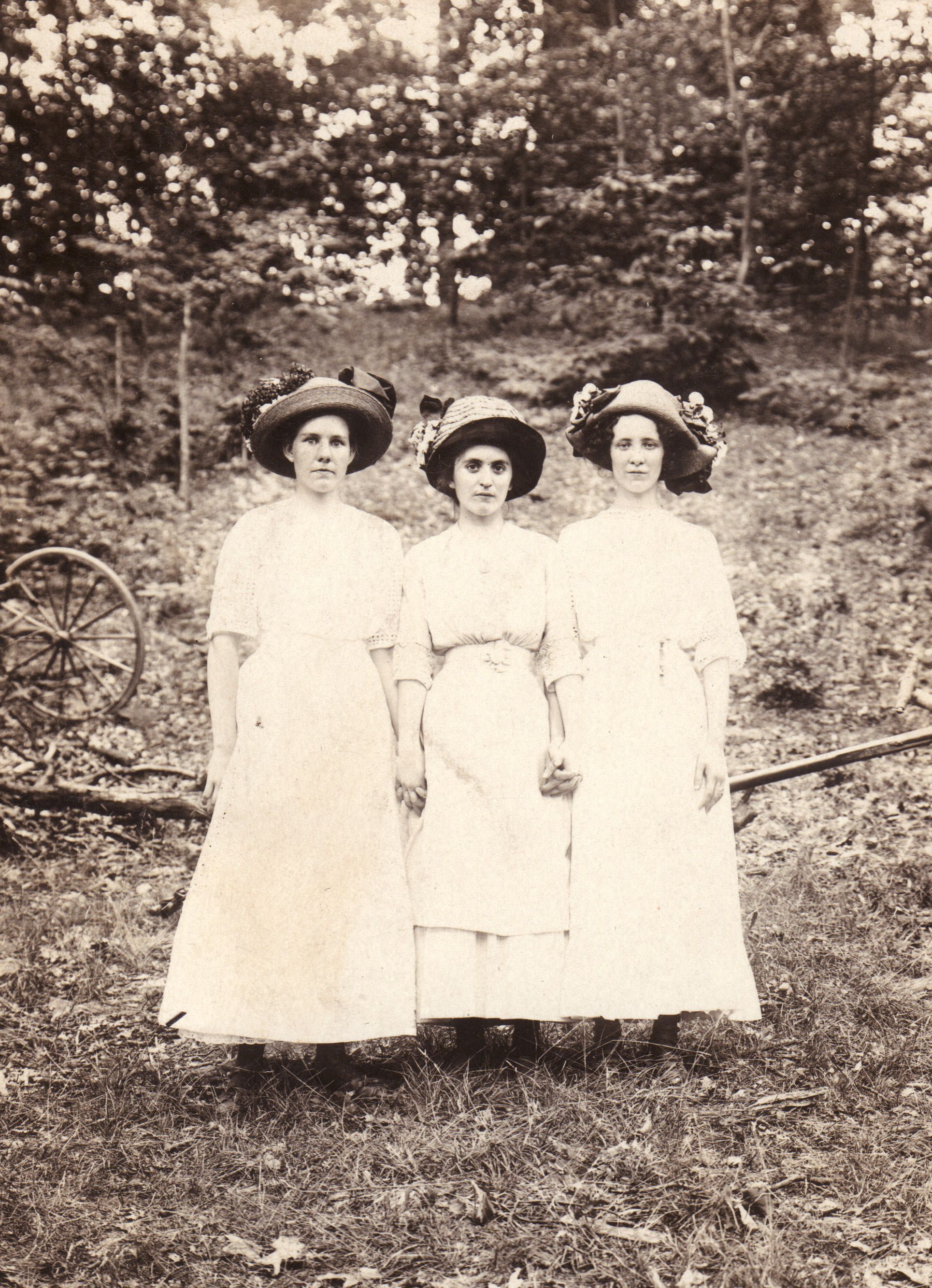 SOURCE CITATION: Daughters of James Ryan Edgar and Emma Jane (Yeager) Edgar - [Left-Right]: Mary Margaret (Edgar) Hennen [1895-1957], Unidentified, Sarah Elizabeth "Lizzie" (Edgar) Dye [1892-1919]; circa 1905-1915; item no. RICE-AN002-0009, Dye-Edgar Series, John Robert Rice Collection, Greene Connections Archives Project (GreeneConnections.com).
