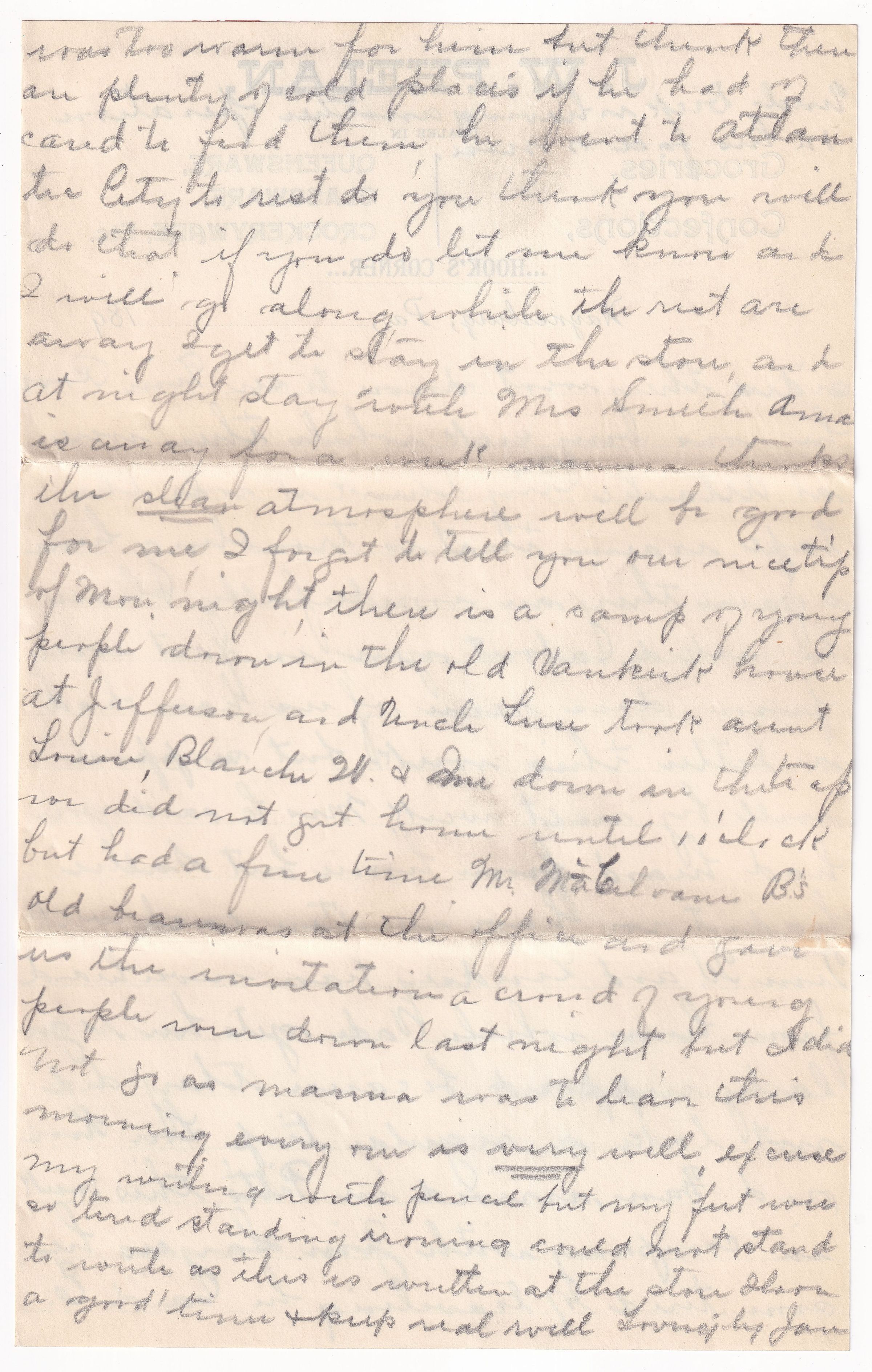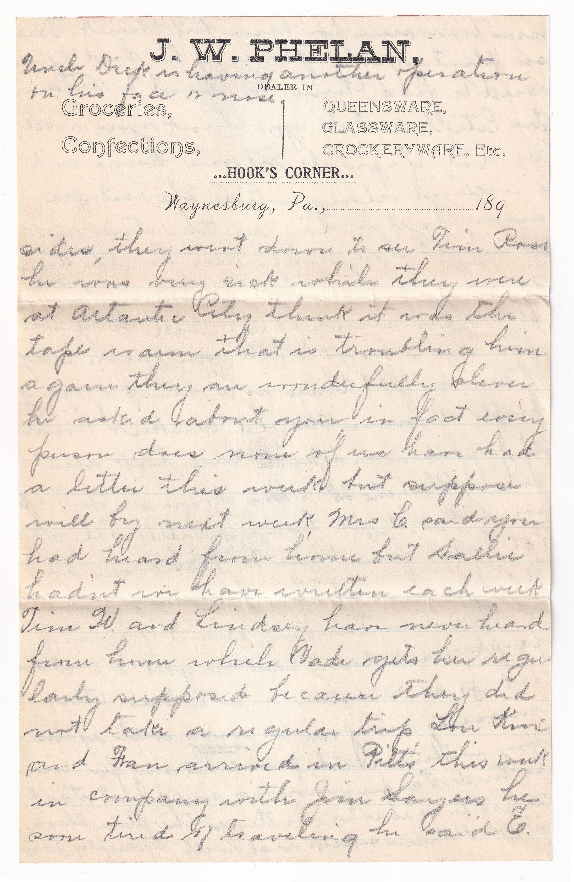 The business of Jane's father, Joseph Walker Phelan [1840-1902], is printed on the letterhead: "J. W. Phelan, / Dealer in / Groceries, Confections / Queensware, Glassware, Crockeryware, Etc. / ...Hook's Corner..."Collection
